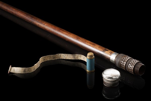 An early 20th-century malacca walking stick with carved wooden handle enclosing a tailor kit. Silver mount and gilded metal cap. English hallmarks (L. cm 96)