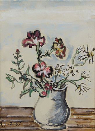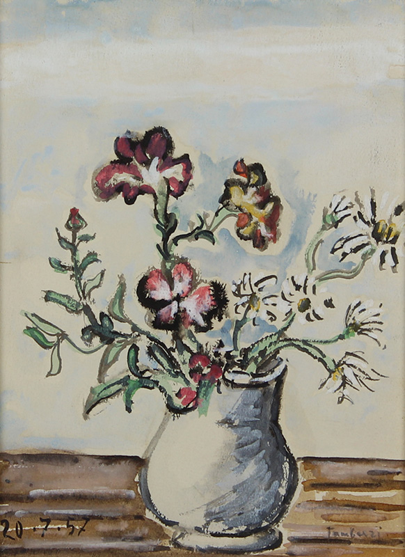Tamburi Orfeo Vaso di fiori, 1957 tempera su carta intelata, cm 27x20,5 firmata in basso a destra, datata in basso a sinistra, autentica dell'artista su foto