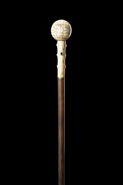Bastone in bambù con presa in avorio inciso a forma di globo terrestre con supp
