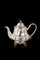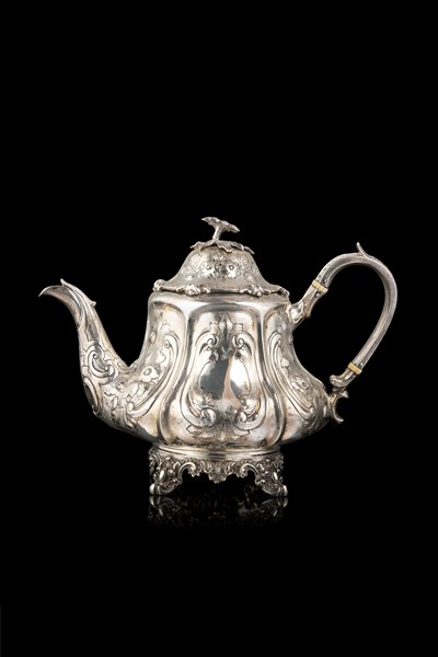 Teiera in argento a corpo piriforme sbalzato e inciso a volute e motivi floreali. Presa del coperchio a fiore a tutto tondo, piedini a ricciolo. Ghiere in osso. Londra, 1855. Argentiere John Wakefield (h. cm 20,5) (g lordi 770) (lievi difetti)