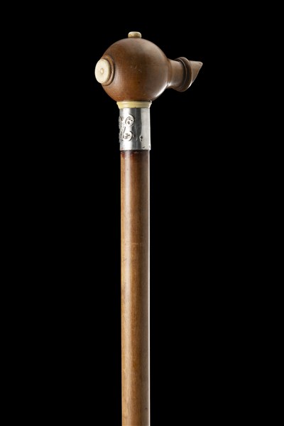 Bastone in malacca con pomolo con fischietto con ghiera in avorio e argento. Fine secolo XIX (L. cm 93) (difetti)