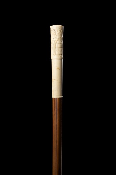 Bastone in malacca con presa in avorio scolpito a figure in abiti ottocenteschi
