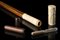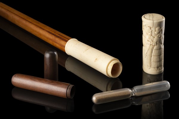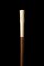 Bastone in malacca con presa in avorio scolpito a figure in abiti ottocenteschi contenente custodia in legno con clessidra. Paesi Bassi, secolo XIX (L. cm 99) (difetti)