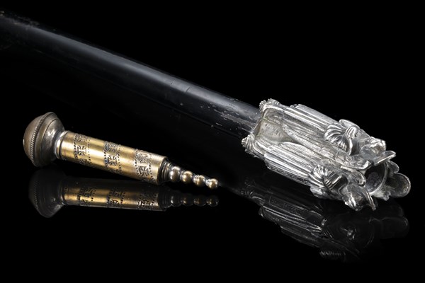 Bastone da prelato in legno ebanizzato con ghiera in argento decorata da tre angeli e aspersorio in vermeille. Secolo XIX (L. cm 95)