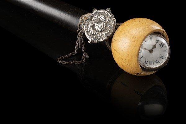 Bastone in ebano con presa in avorio tornito con orologio da tasca a sfera. Ghiera in metallo argentato con volto di dama e portachiavetta. Inghilterra, secolo XIX (L. cm 86) (difetti e mancanze)