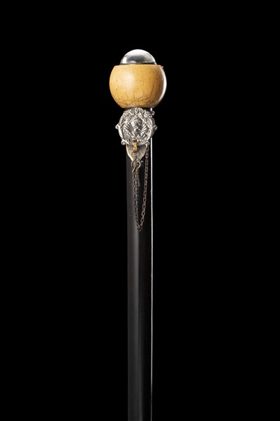 Bastone in ebano con presa in avorio tornito con orologio da tasca a sfera. Ghi