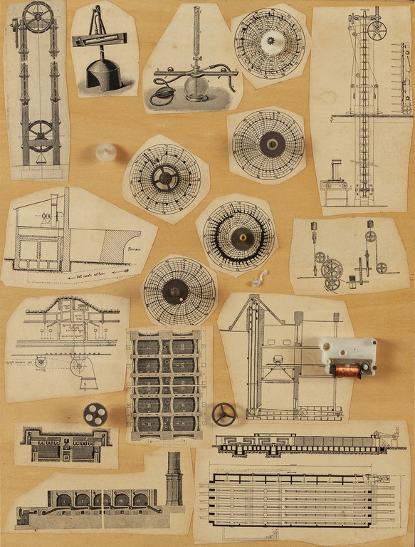 ingranaggi e collage su tavola cm 40x30