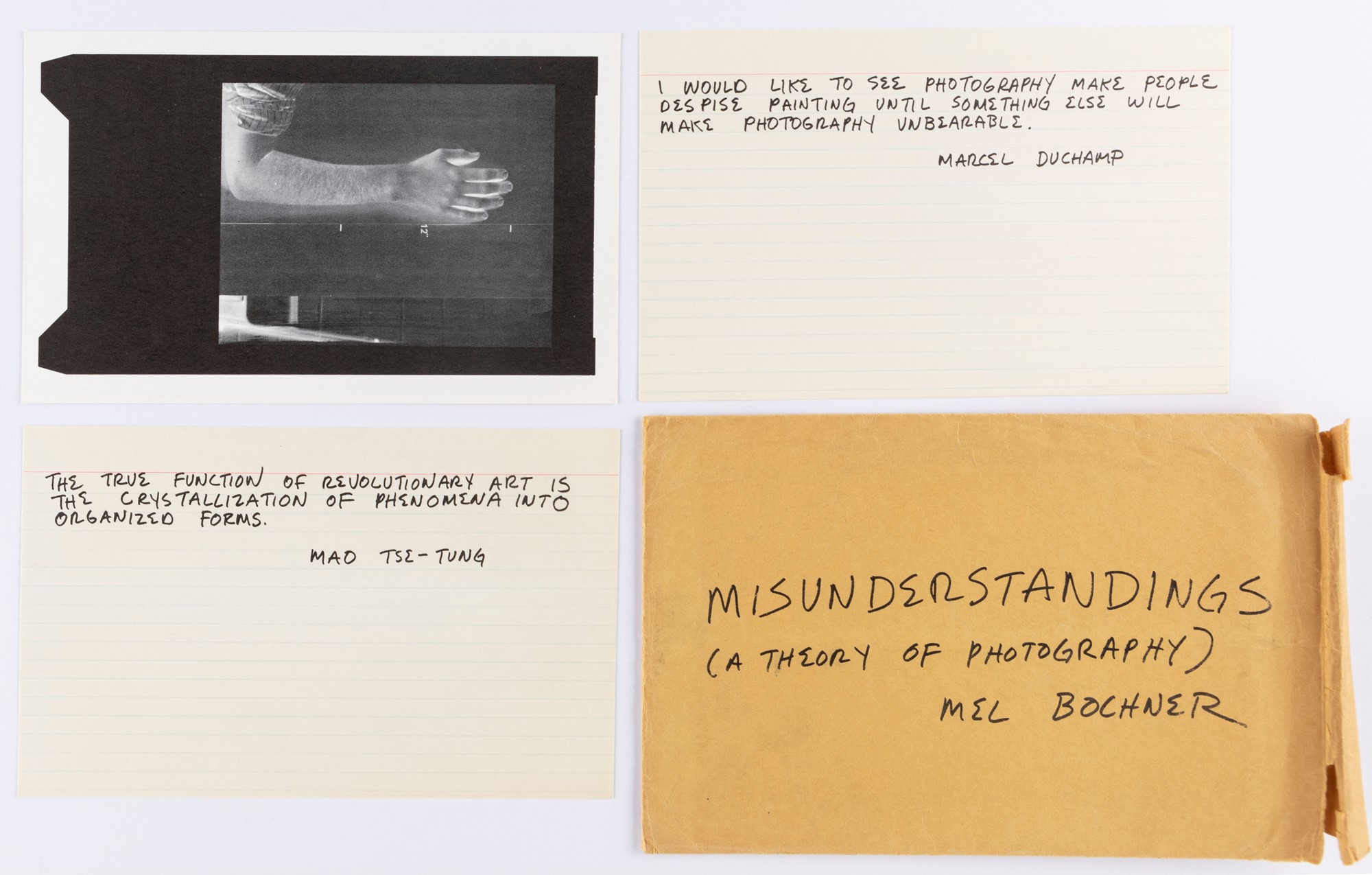 c. Busta contente 10 carte delle quali una illustrata con una foto in bianco e nero e 9 con riproduzioni di testi manoscritti di Mao Tze-Tung, Emile Zola, Taine, Marcel Duchamp, Marcel Proust e altri. Tiratura di 1200 copie. , cm 13 x 21 cad.