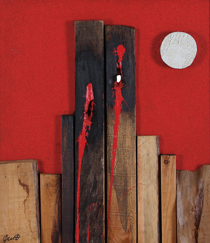 PIERLUIGI DE LUTTI Monfalcone 1959 Doppia ferita tecnica mista, acrilico, legni e combustioni su tavola cm. 70x60, firma in basso a sinistra, firma e titolo su etichetta dell'artista al retro, dichiarazione d'autenticità dell'artista su foto.