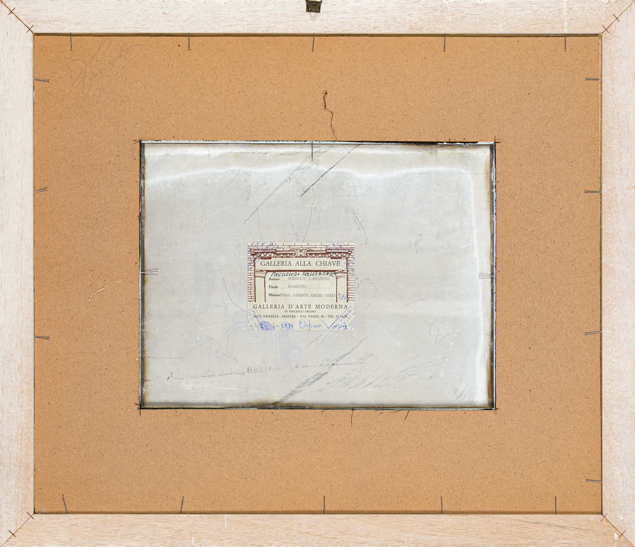 Etichetta e timbri della Galleria Alla Chiave (VE) con caratteristiche tecniche dell'opera, firma dell'Artista, e numerazione (Esemplare 20/100) al retro