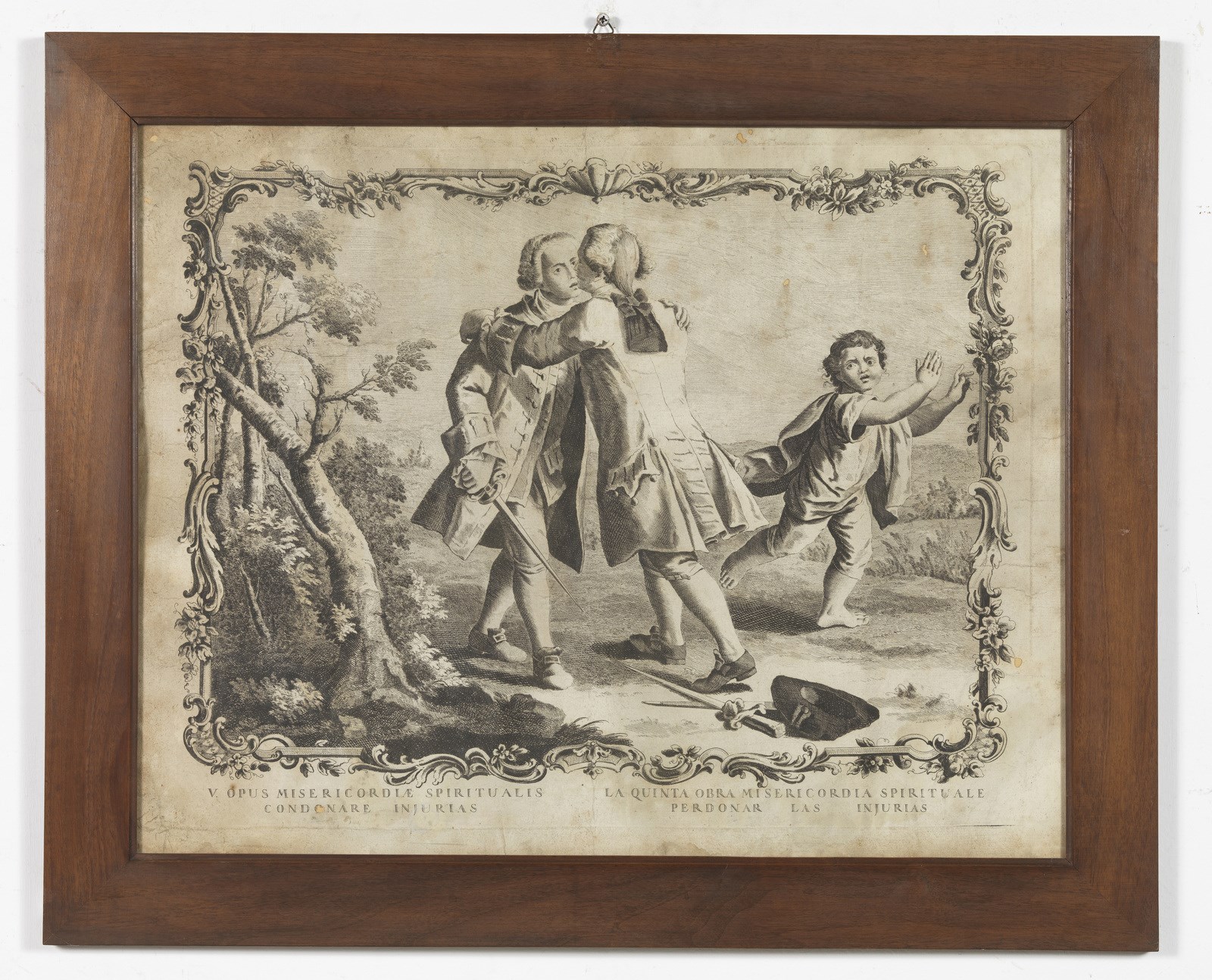 VOLPATO GIOVANNI (1733 - 1803) Le opere corporali di misericordia. Incisione. Cm 55,00 x 43,50. Serie di tre tavole su sette, titolate nel margine inferiore e numerate a sinistra in cifre romane. Si deve a Giorgio Marini l'assegnazione dell'opera alla mano di Volpato che la eseguì per Remondini nel 1768. Nel Catalogo Remondini la serie fa parte dell'assortimento vastissimo di "Stampe in foglio Reale", il doppio titolo in latino e spagnolo dichiara che era destinata all'esportazione in Spagna e nelle colonie spagnole. . Cornice presente