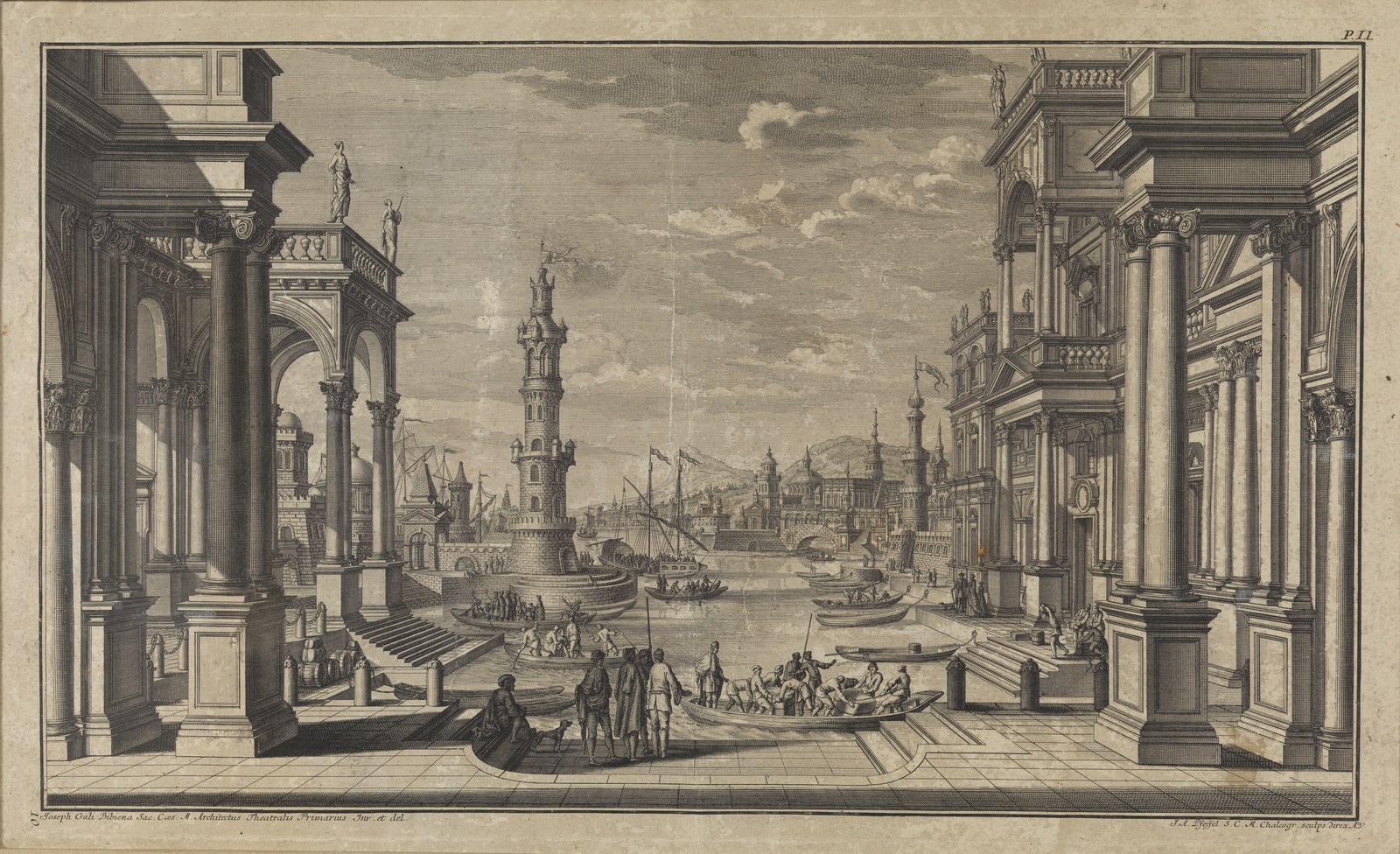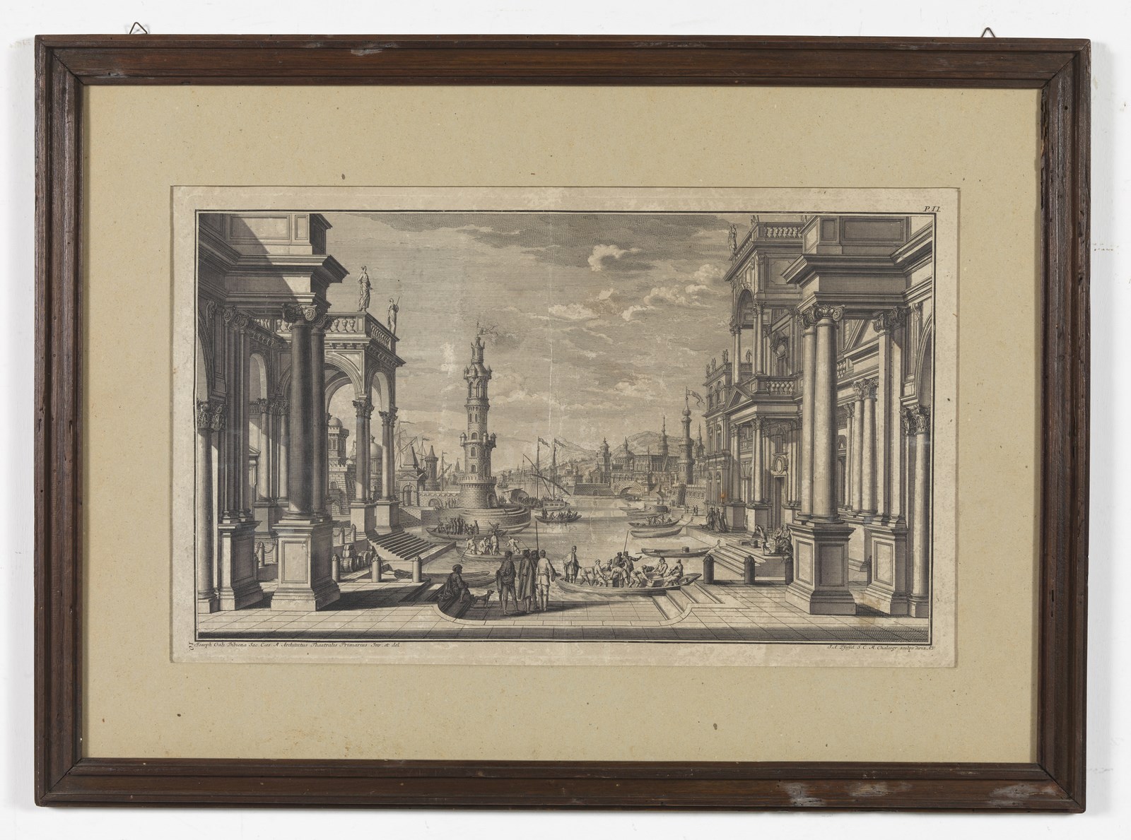 PFEFFEL JOHANN ANDREAS (1674 - 1748) Veduta immaginaria di porto fluviale, campidoglio antico, templi e regia. . Incisione. Cm 64,50 x 46,00. Firmato in lastra. Da Giuseppe Galli Bibiena (1695-1757). . Cornice presente