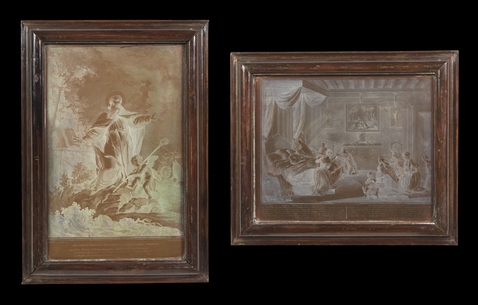 MANIFATTURA DEL XVIII SECOLO - Coppia di matrici per incisioni raffiguranti S. Romualdo e il Sacramento dell'Estrema Unzione.
