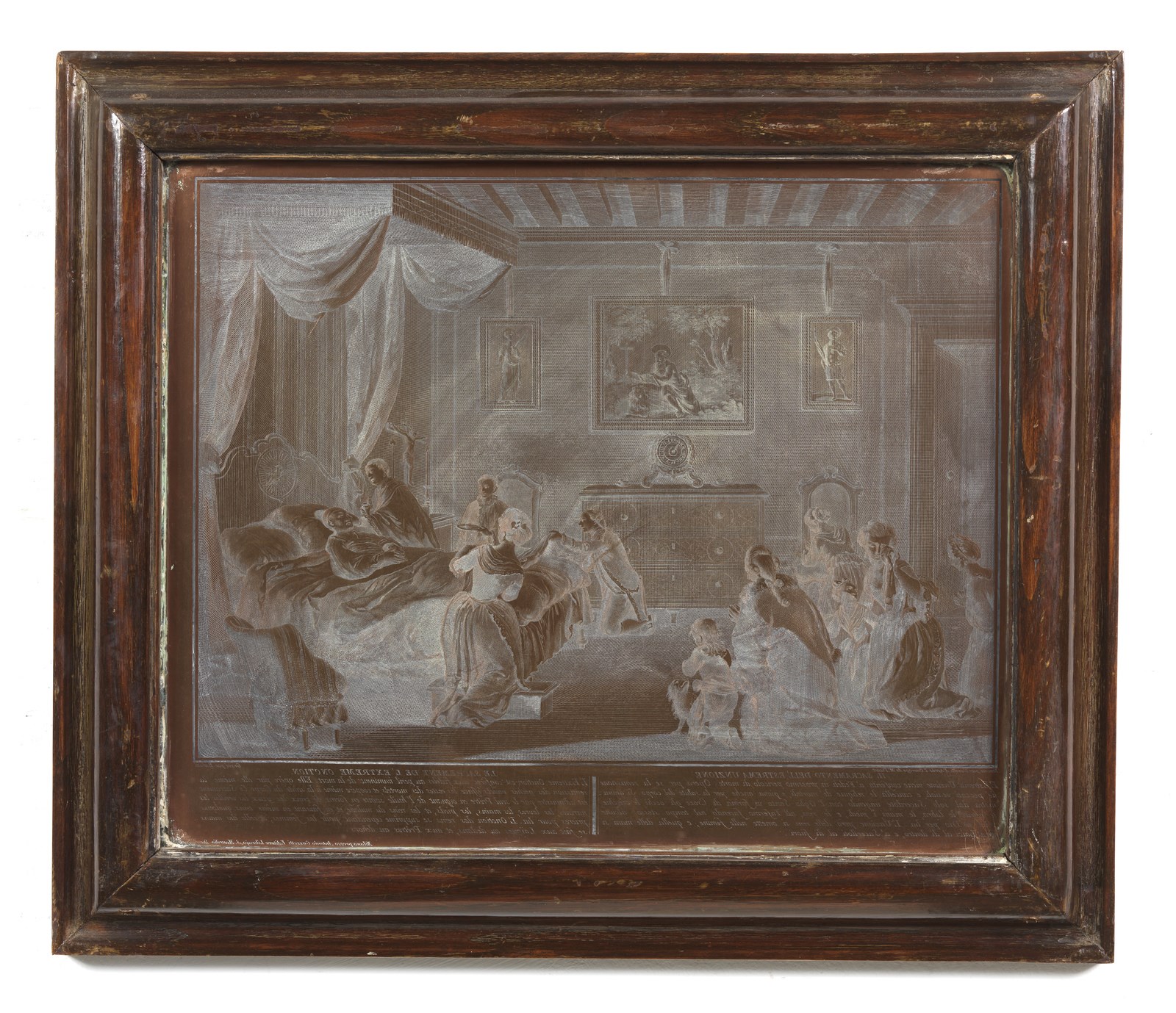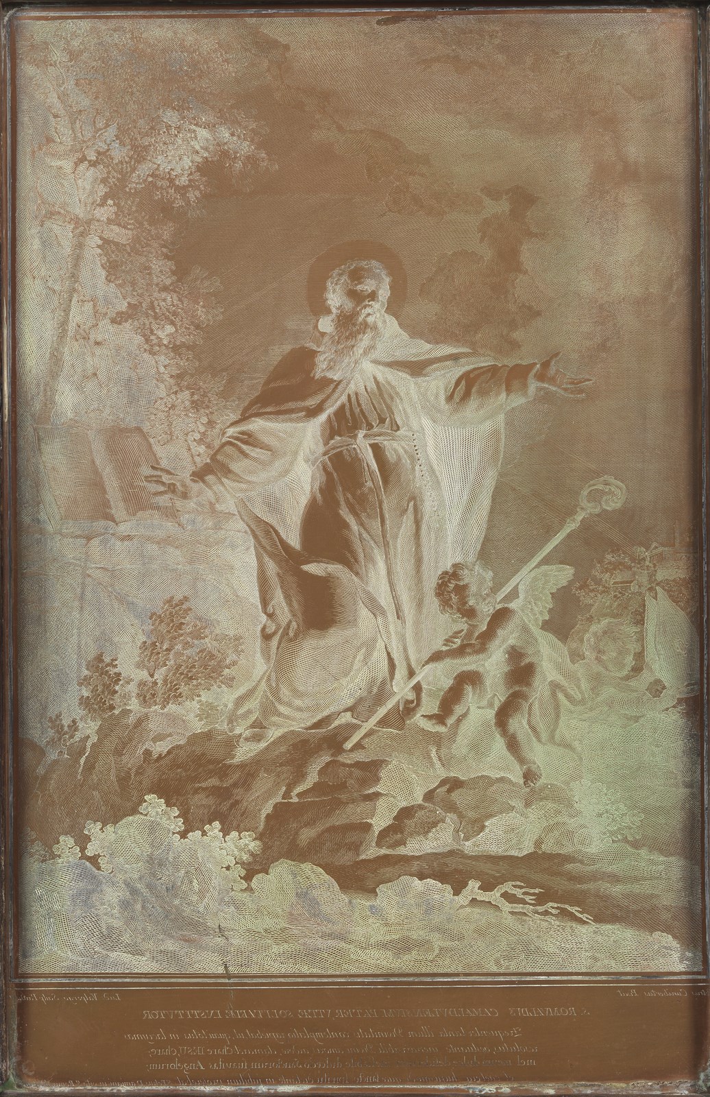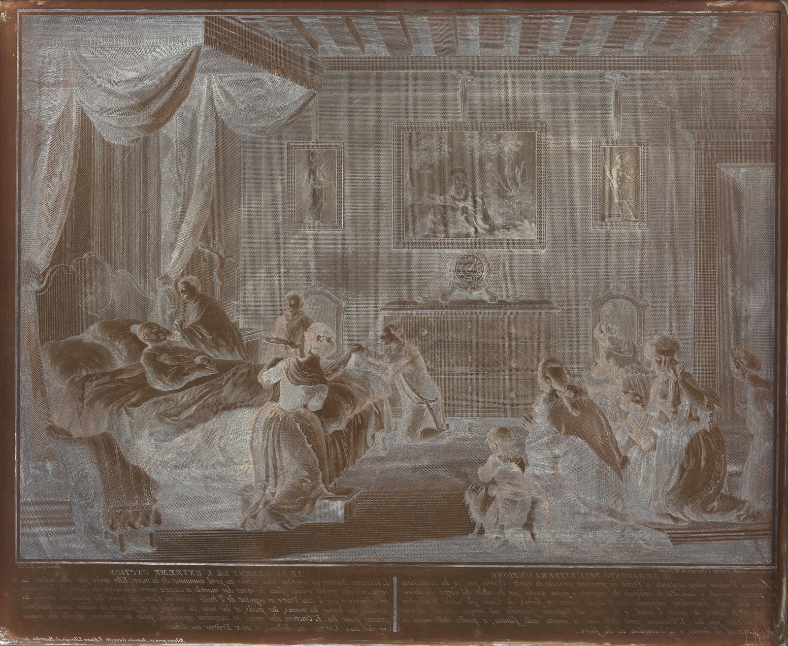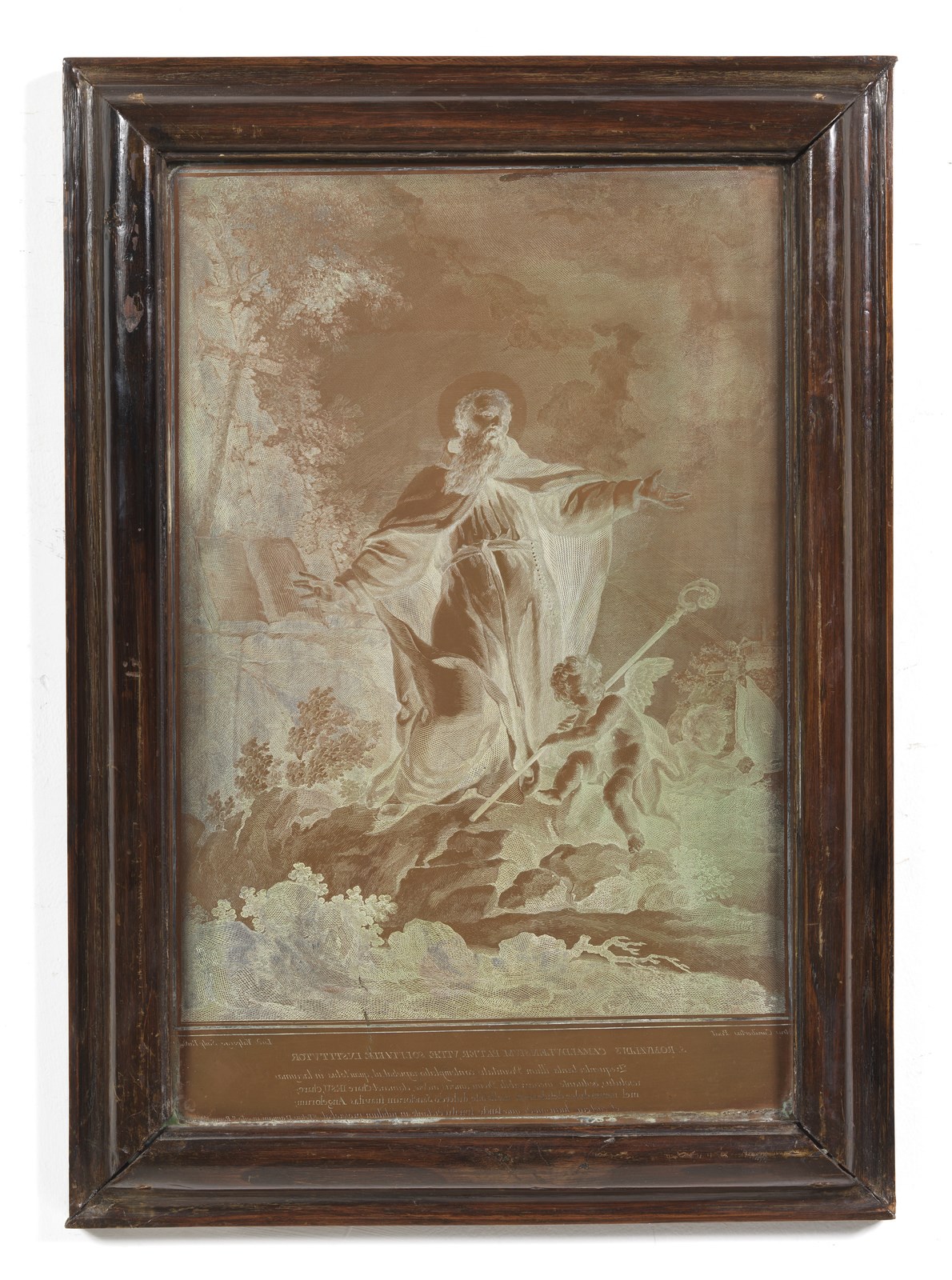 MANIFATTURA DEL XVIII SECOLO Coppia di matrici per incisioni raffiguranti S. Romualdo e il Sacramento dell'Estrema Unzione. lastra per incisione su rame. Cm 29,00 x 45,00. 30,5x37,5 cm. Cornice presente