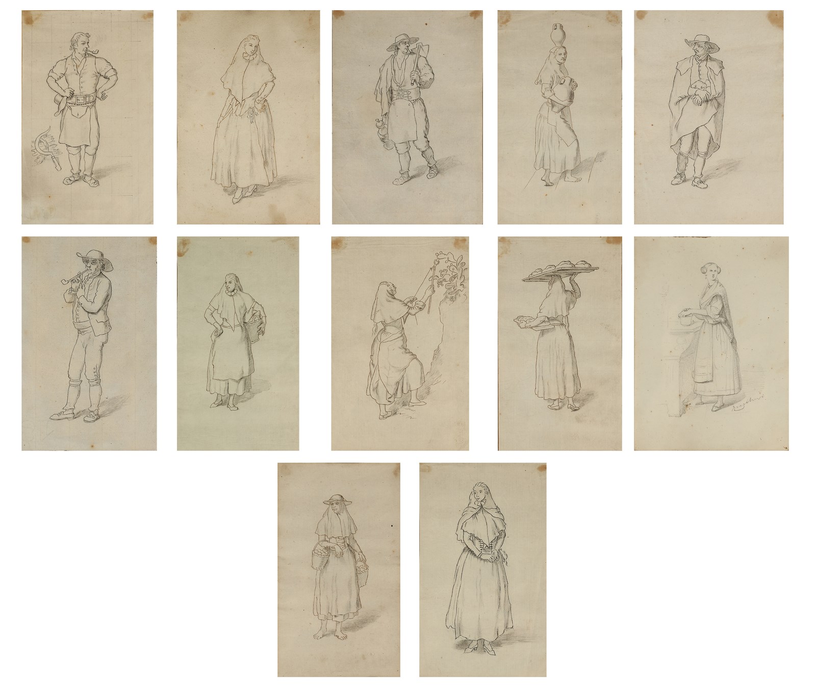 ARTISTA VENETO DEL XIX SECOLO Gruppo di dodici disegni raffiguranti personaggi in abiti ottocenteschi.