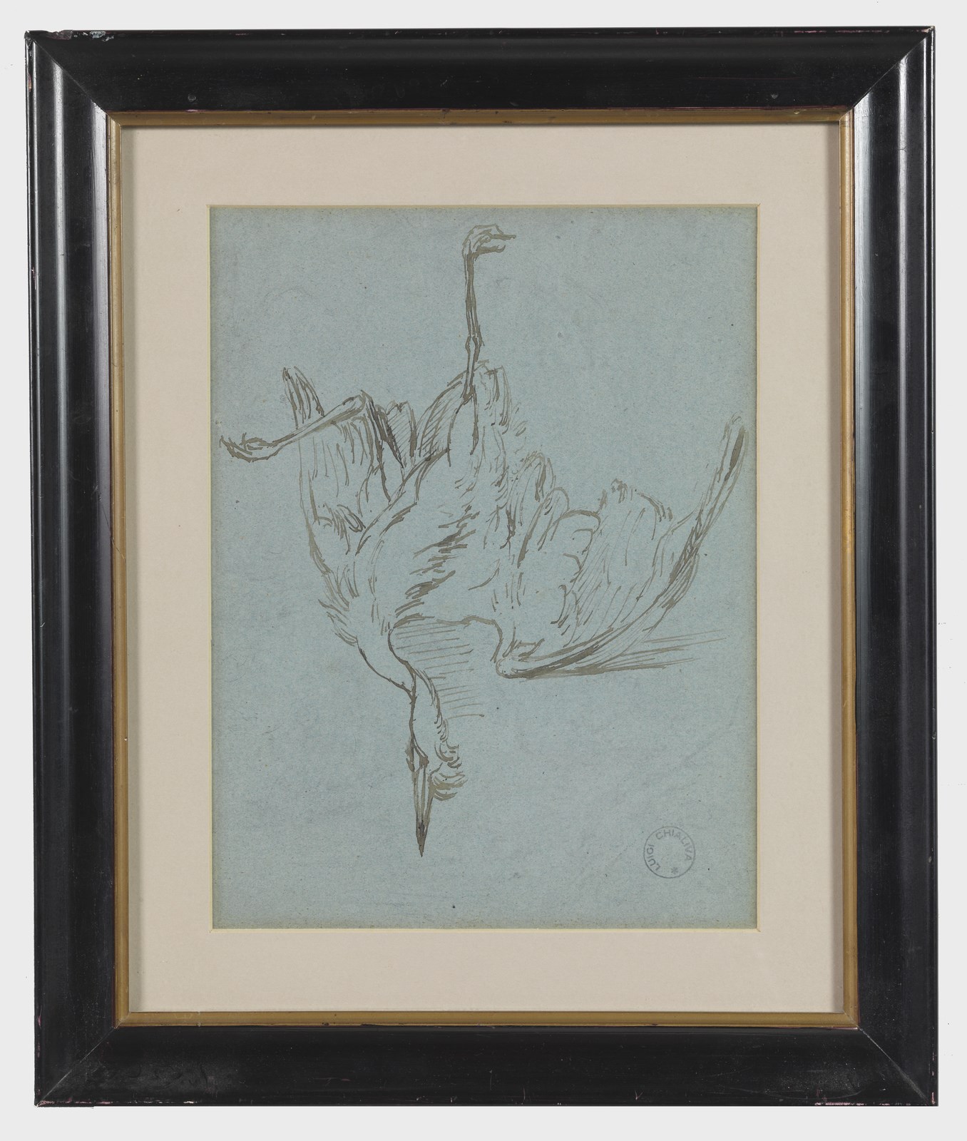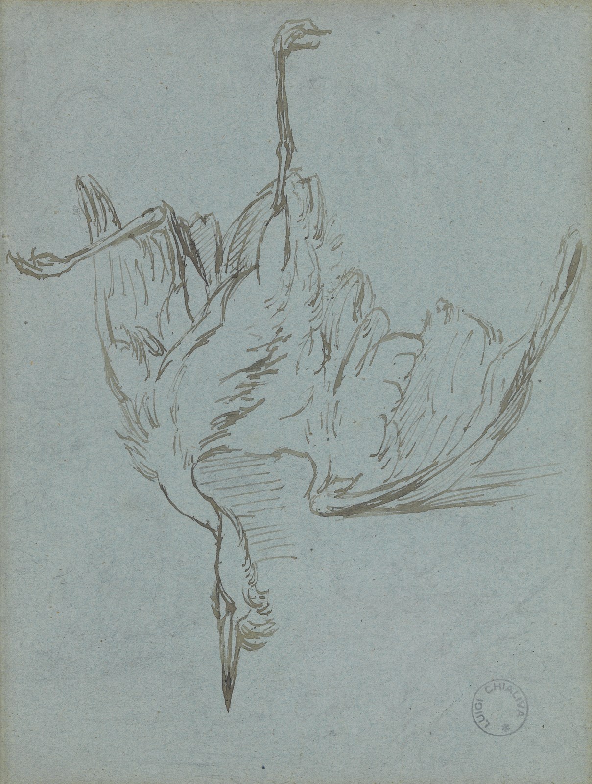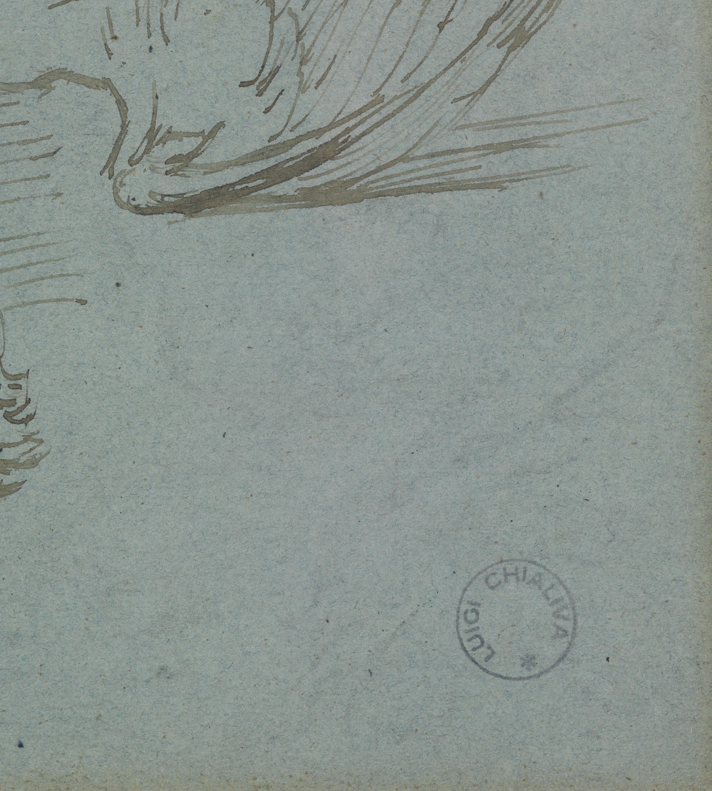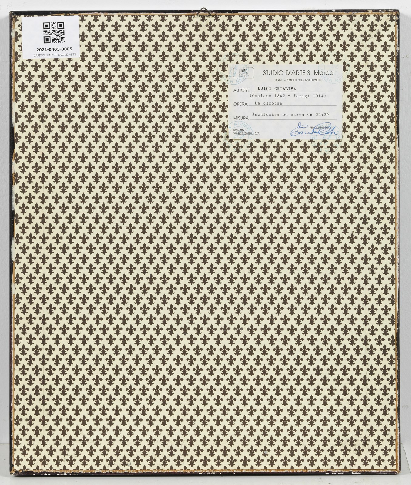 CHIALIVA LUIGI (1842 - 1914) La cicogna. Inchiostro su carta. Cm 22,00 x 29,00. Timbro dell'atelier in basso a destra. Al retro cartiglio descrittivo Studio d'Arte S. Marco. Autentica su fotografia a cura di Studio d'Arte S. Marco. . Cornice presente