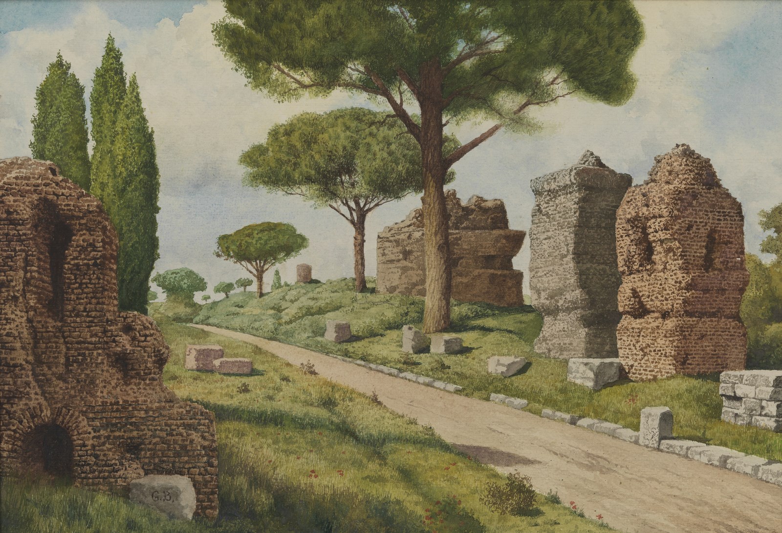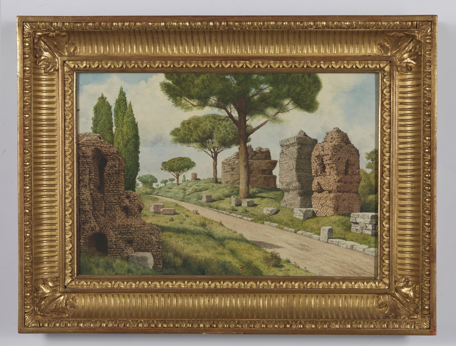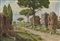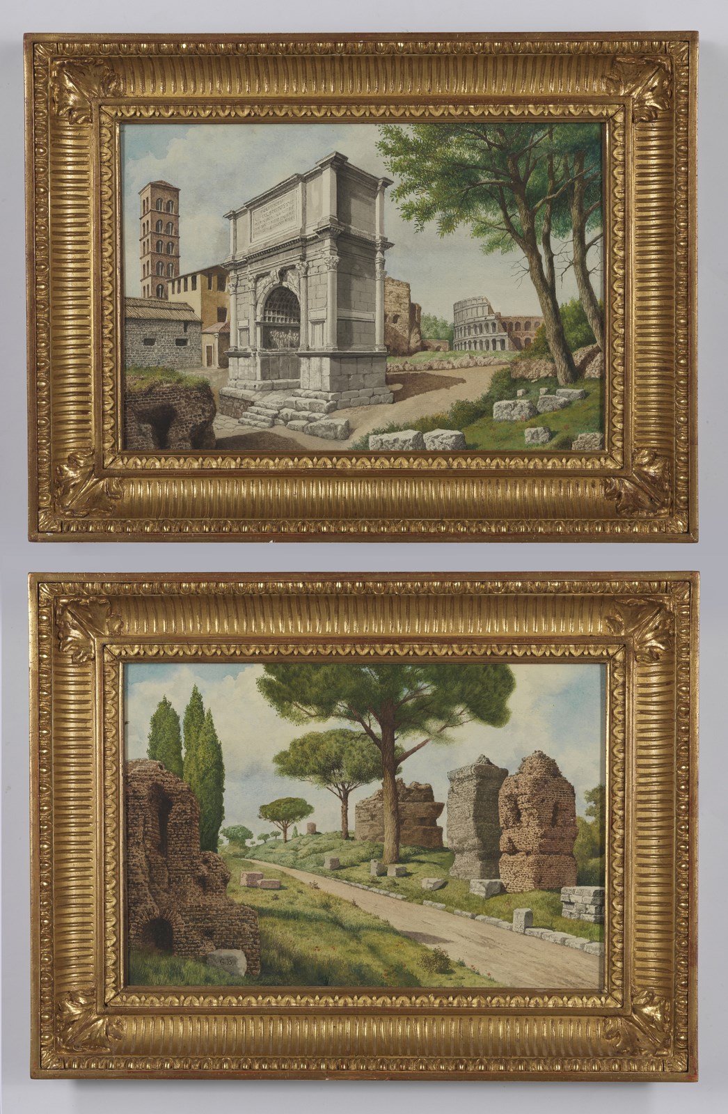 ARTISTA DEL XIX SECOLO Coppia di dipinti raffiguranti l'Arco di Tito e le rovine sulla Via Appia. . Acquarello su carta. Cm 45,00 x 31,00. Una carta riporta la firma monogrammata G.B. in basso a sinistra. . Cornice presente