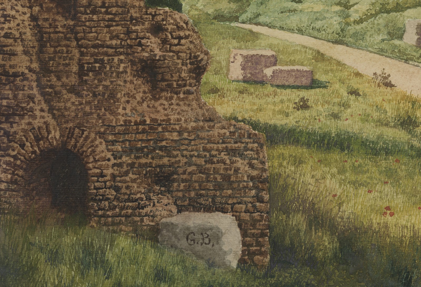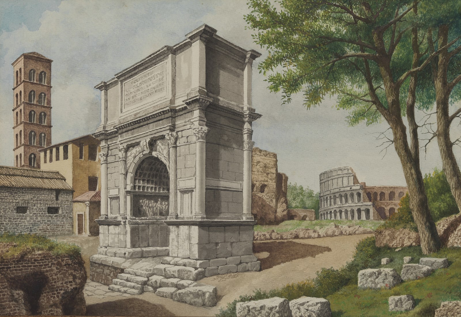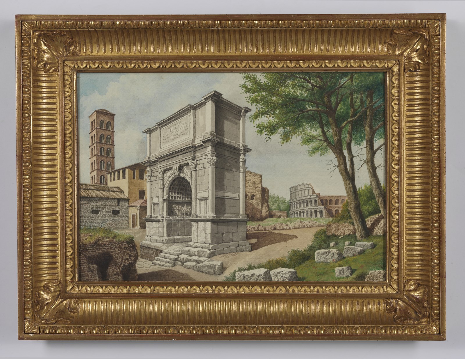ARTISTA DEL XIX SECOLO Coppia di dipinti raffiguranti l'Arco di Tito e le rovine sulla Via Appia. . Acquarello su carta. Cm 45,00 x 31,00. Una carta riporta la firma monogrammata G.B. in basso a sinistra. . Cornice presente