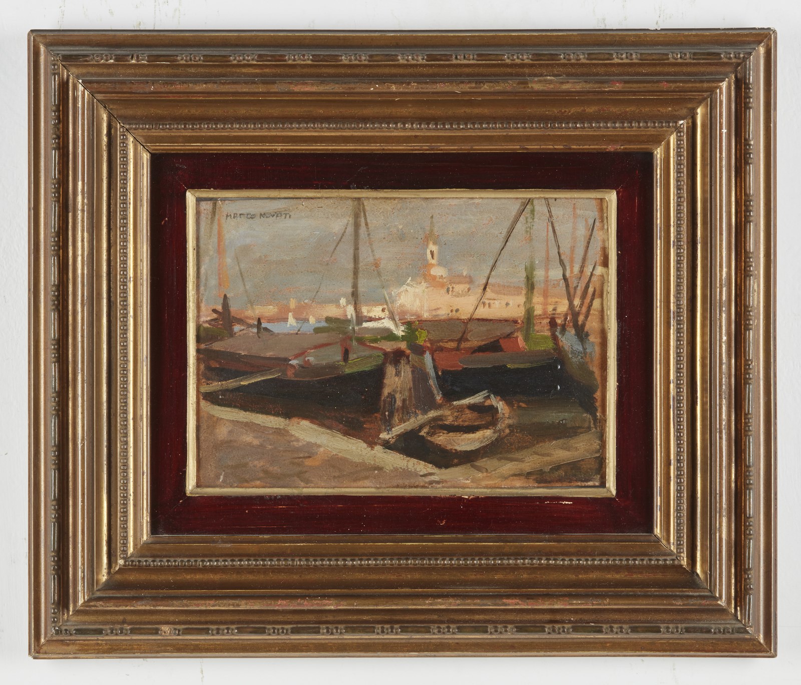 NOVATI MARCO (1895 - 1975) Veduta veneziana. . Olio su cartone. Cm 21,50 x 15,50. Firmato in alto a sinistra. . Cornice presente