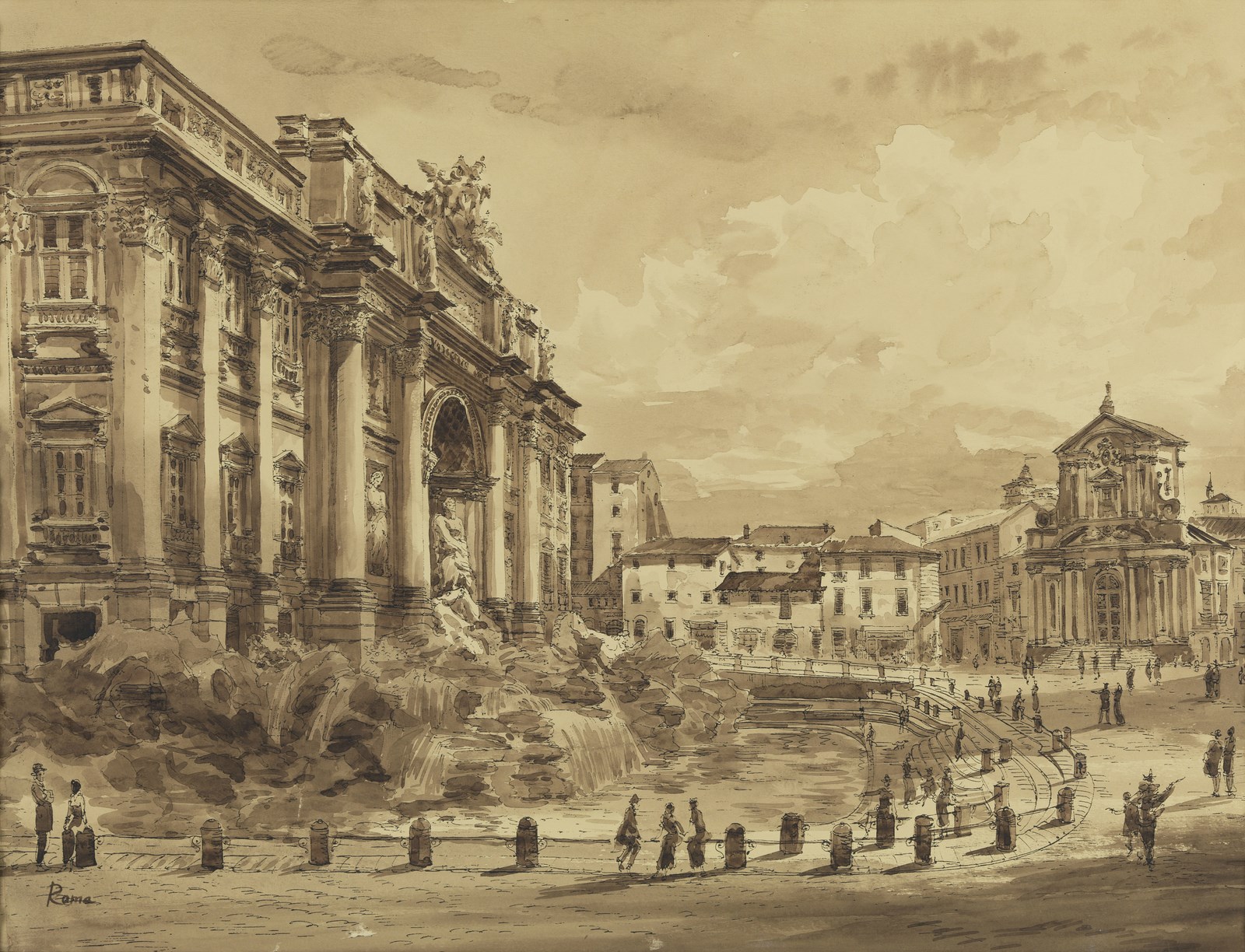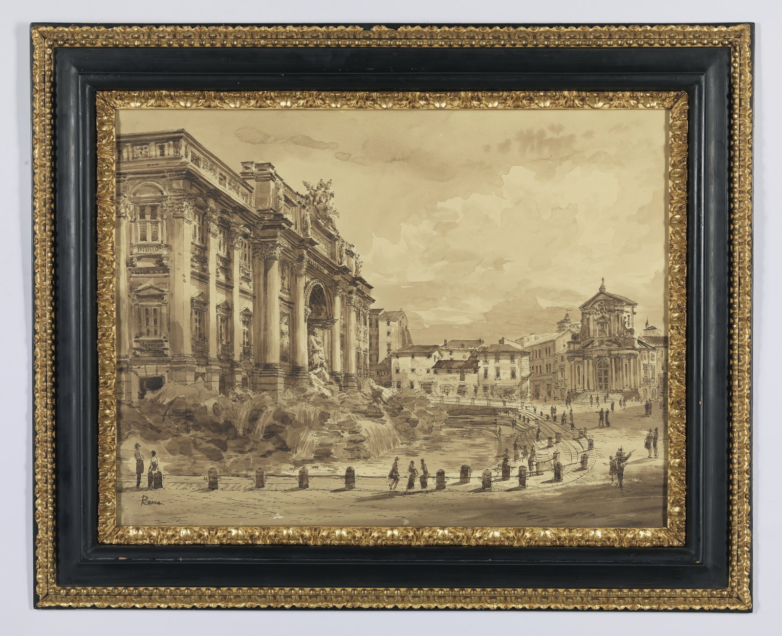 ARTISTA DELLA FINE DEL XIX SECOLO Veduta della Fontana di Trevi con la Chiesa dei Santi Vincenzo e Anastasio. . China e acquarello su carta. Cm 62,50 x 48,50. Al retro etichetta "R. C. Goff", forse riconducibile a Robert Charles Goff (1837-1922). Cornice presente