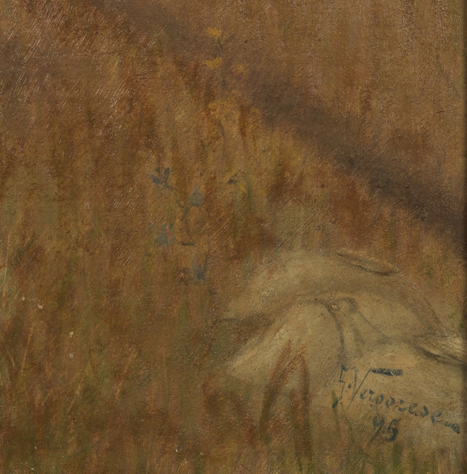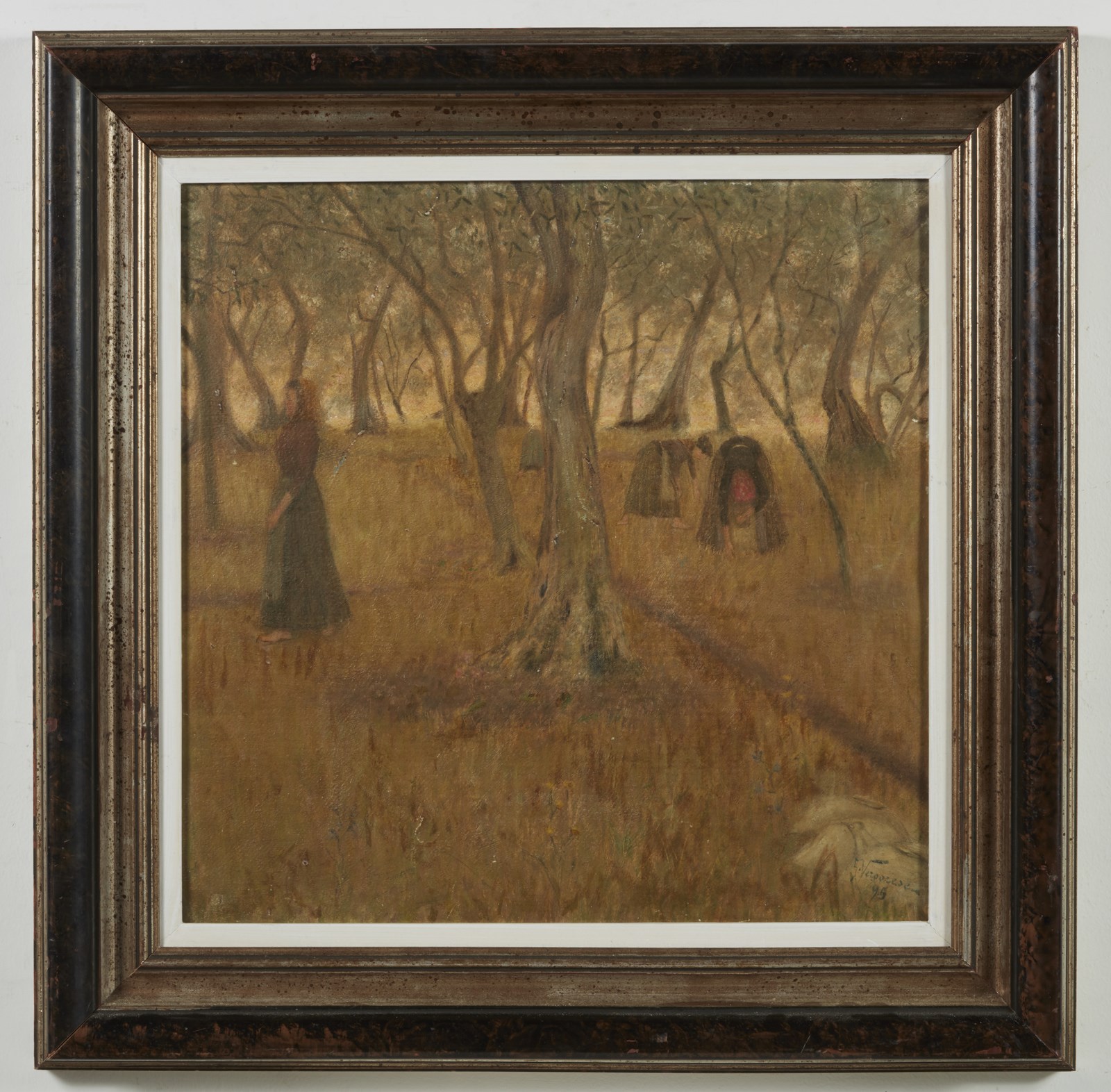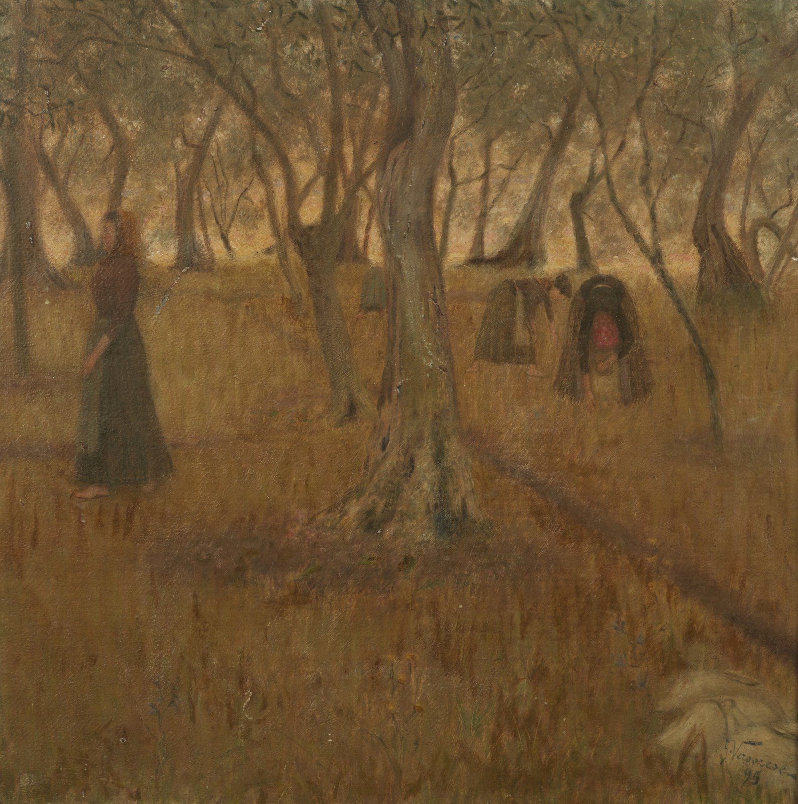 VERSORESE GIULIO (1868 - 1900) Paesaggio con contadine. . Olio su cartone. Cm 50,00 x 50,00. Firmato e datato 1899 in basso a destra. Difetti. Cornice presente
