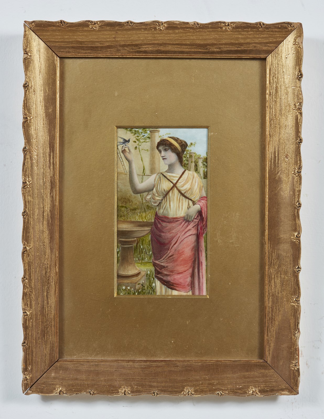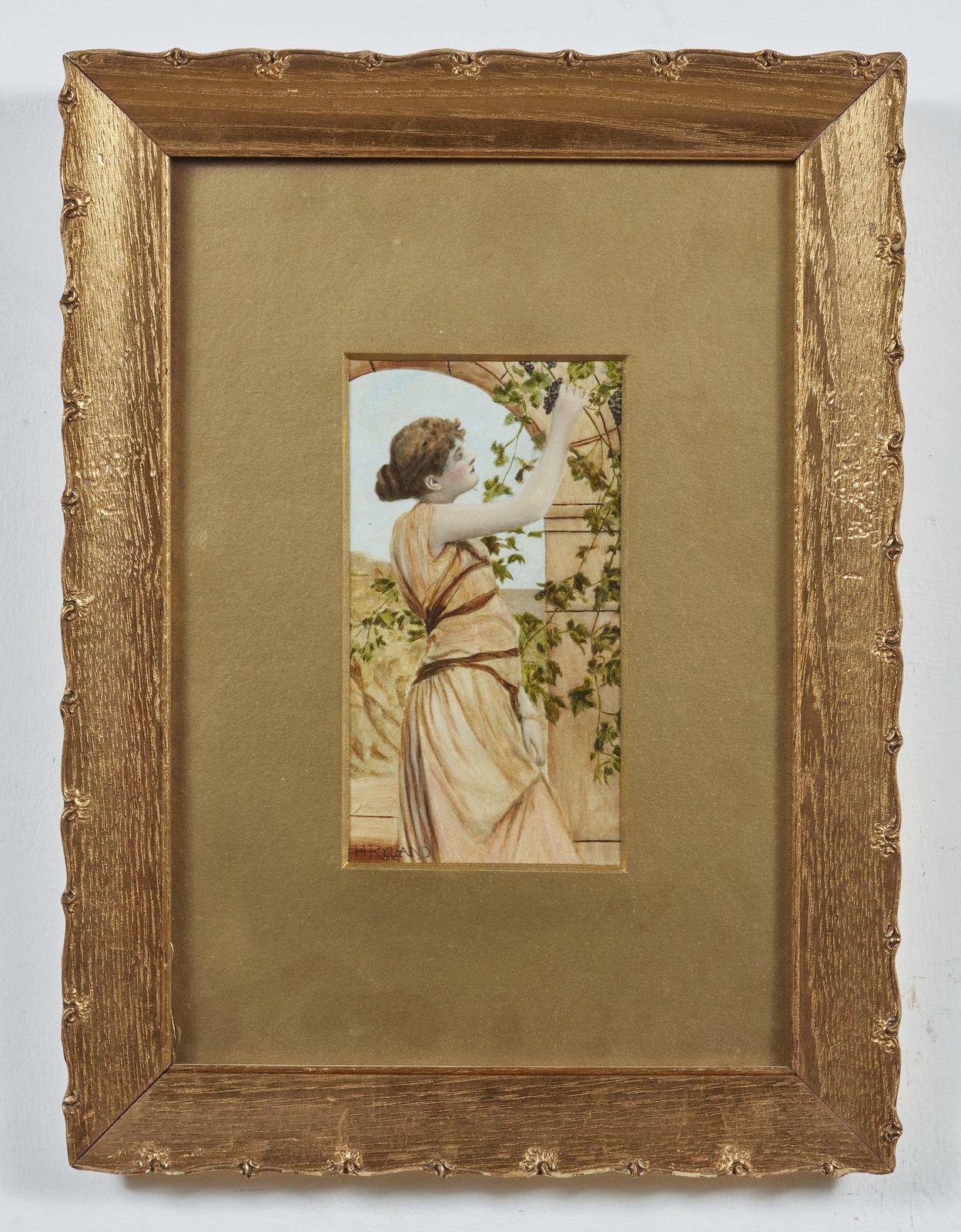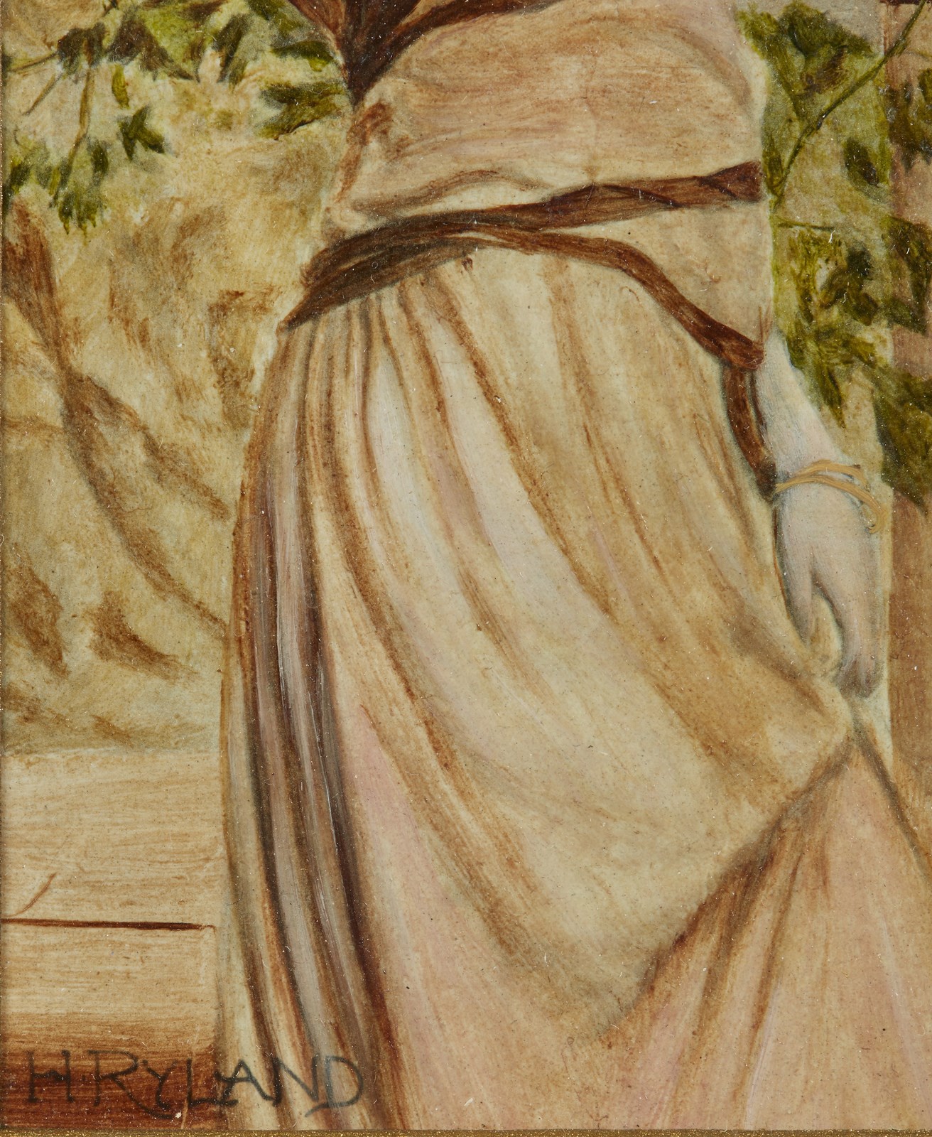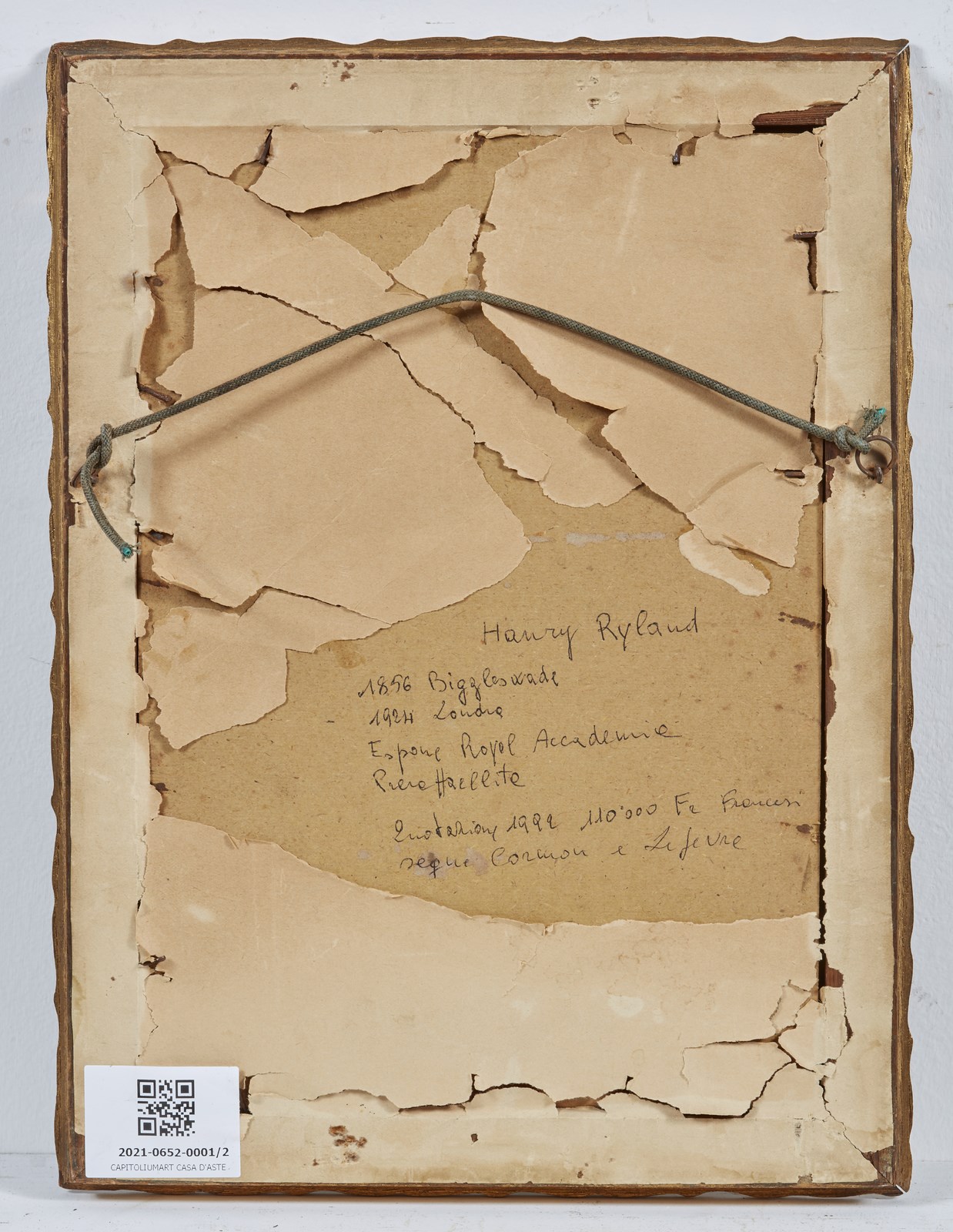 RYLAND HENRY (1856 - 1924) Coppia di dipinti raffiguranti ritratto di fanciulle in abiti classici. Tecnica mista su carta. Cm 14,00 x 22,50. Firmato in basso a sinistra. Cornice presente