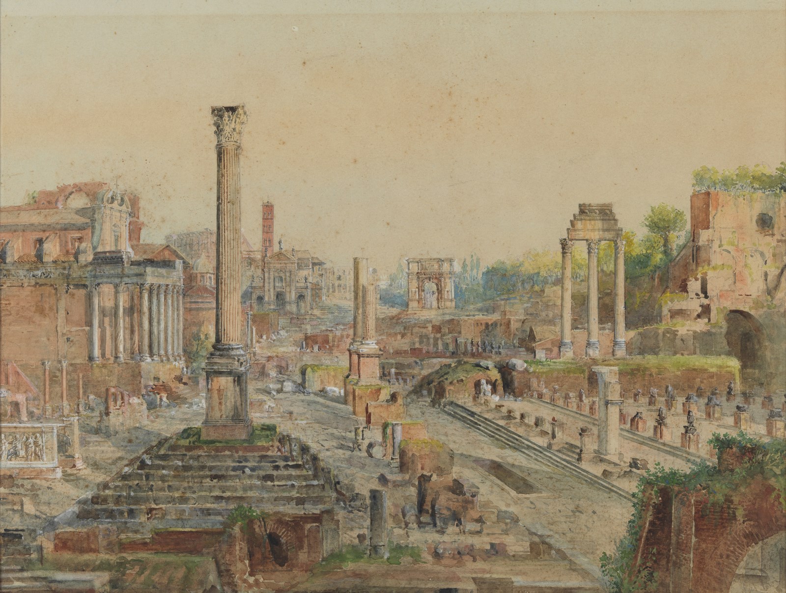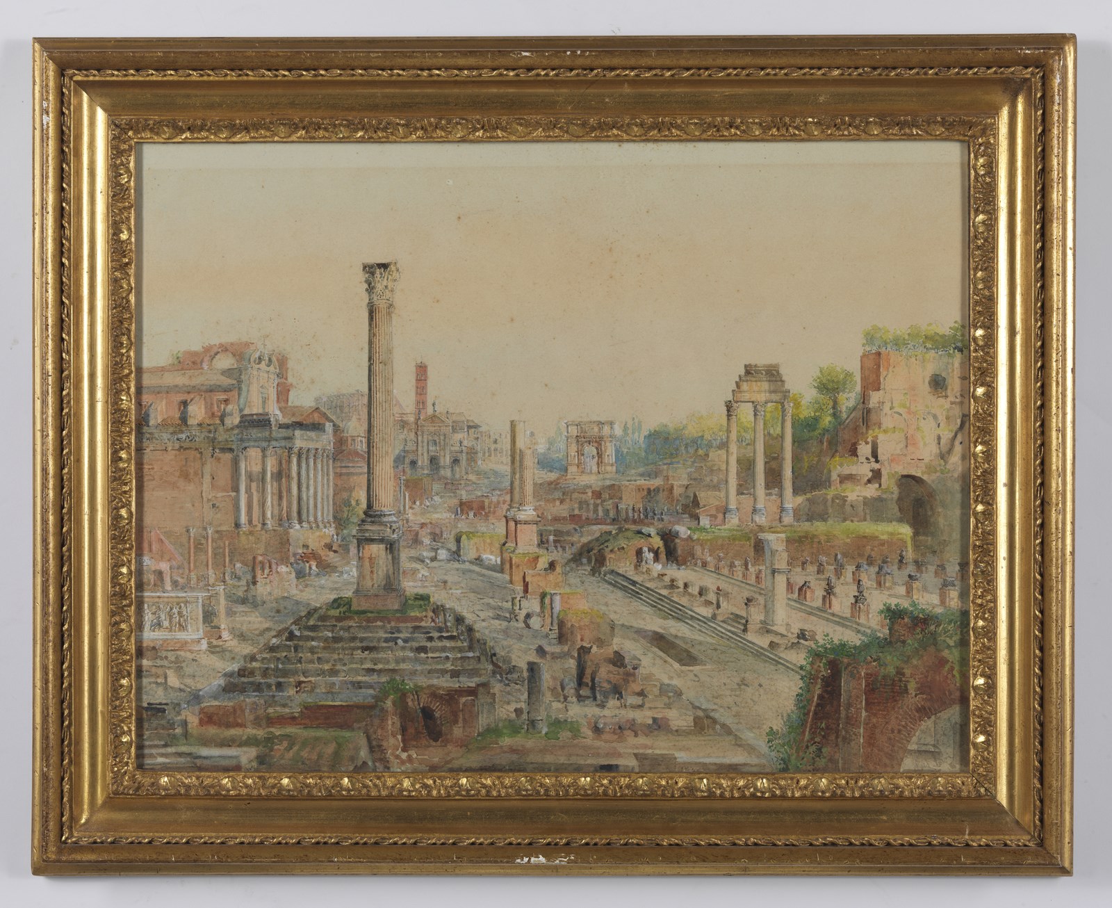 MARTIN JUAN JIMENEZ (1855 - 1901) Il foro romano e la colonna di Foca. Acquarello su carta. Cm 51,50 x 39,50. Tracce di firma in basso a destra. . Cornice presente