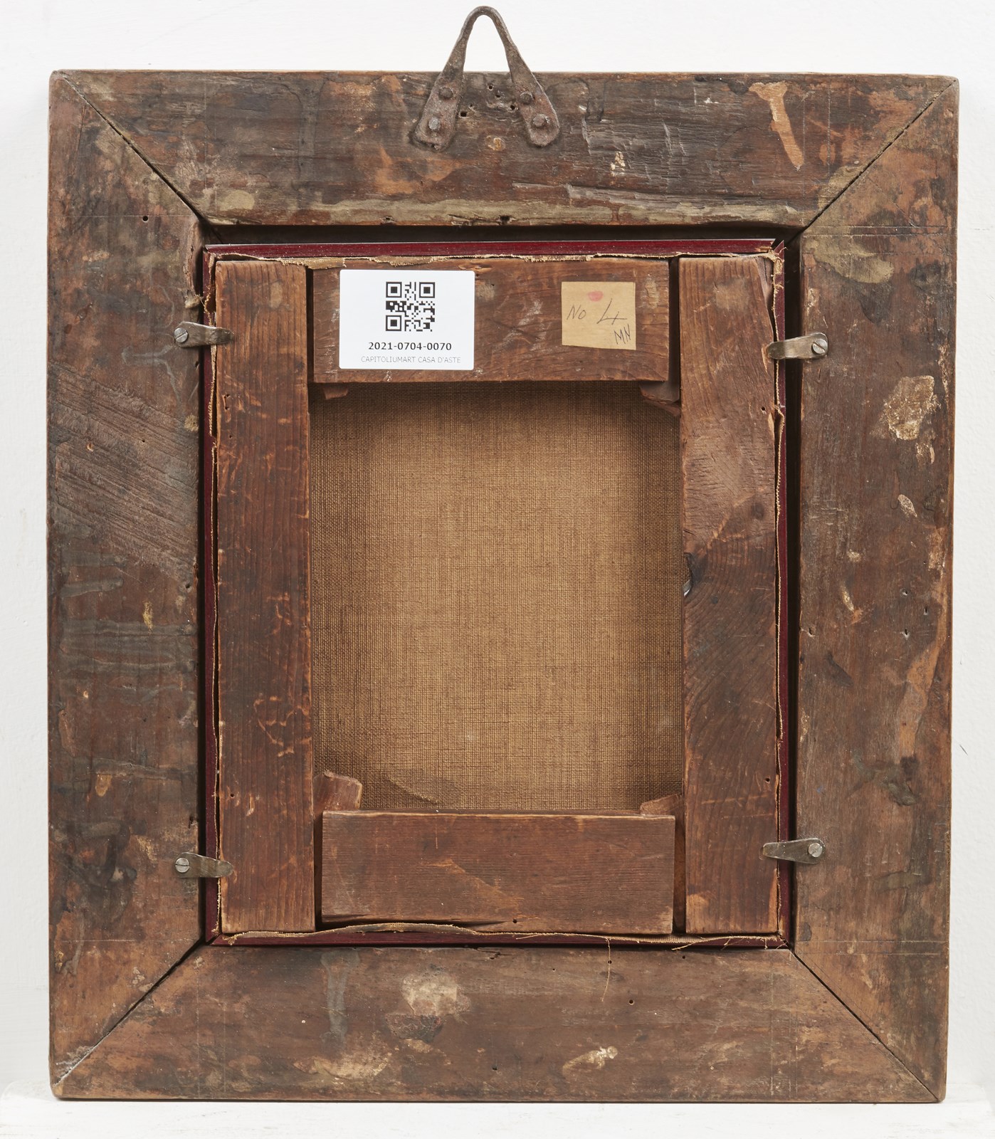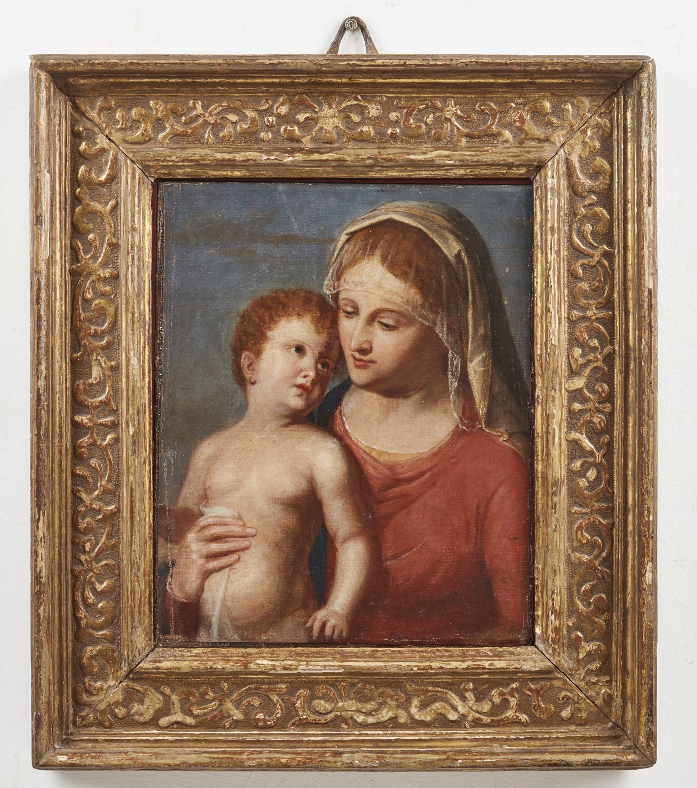 ARTISTA ITALIANO DEL XVII SECOLO Madonna con Bambino. Olio su carta applicata su tela. Cm 22,00 x 27,00. In cornice dorata a cassetta. Cornice presente