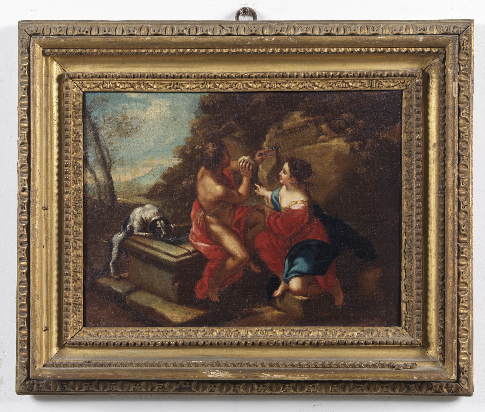 ARTISTA DEL XVIII SECOLO Angelica e Medoro. . Olio su tela . Cm 30,50 x 24,00. . Cornice presente