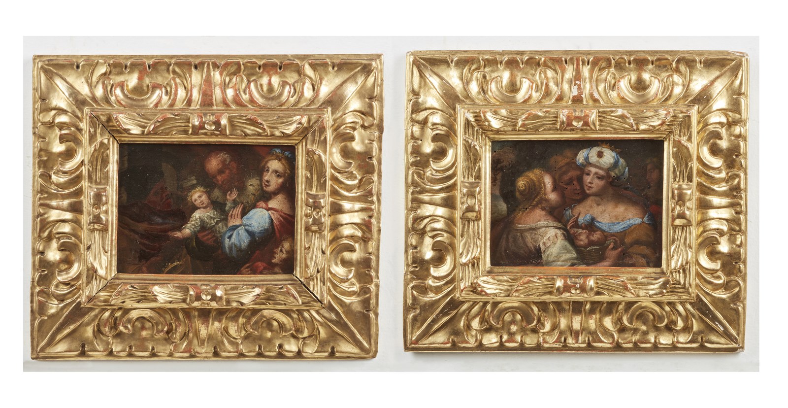 ARTISTA DEL XVIII SECOLO - Coppia di dipinti raffiguranti Scena sacra e il Ritrovamento di Mosè.