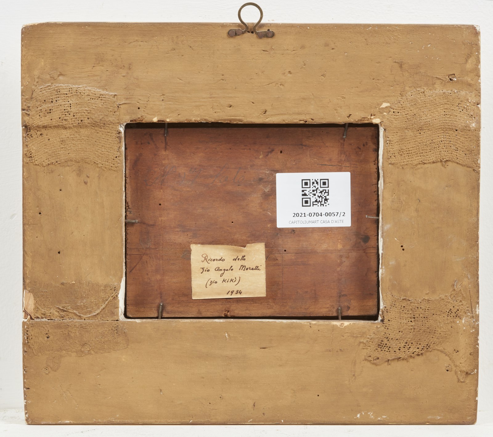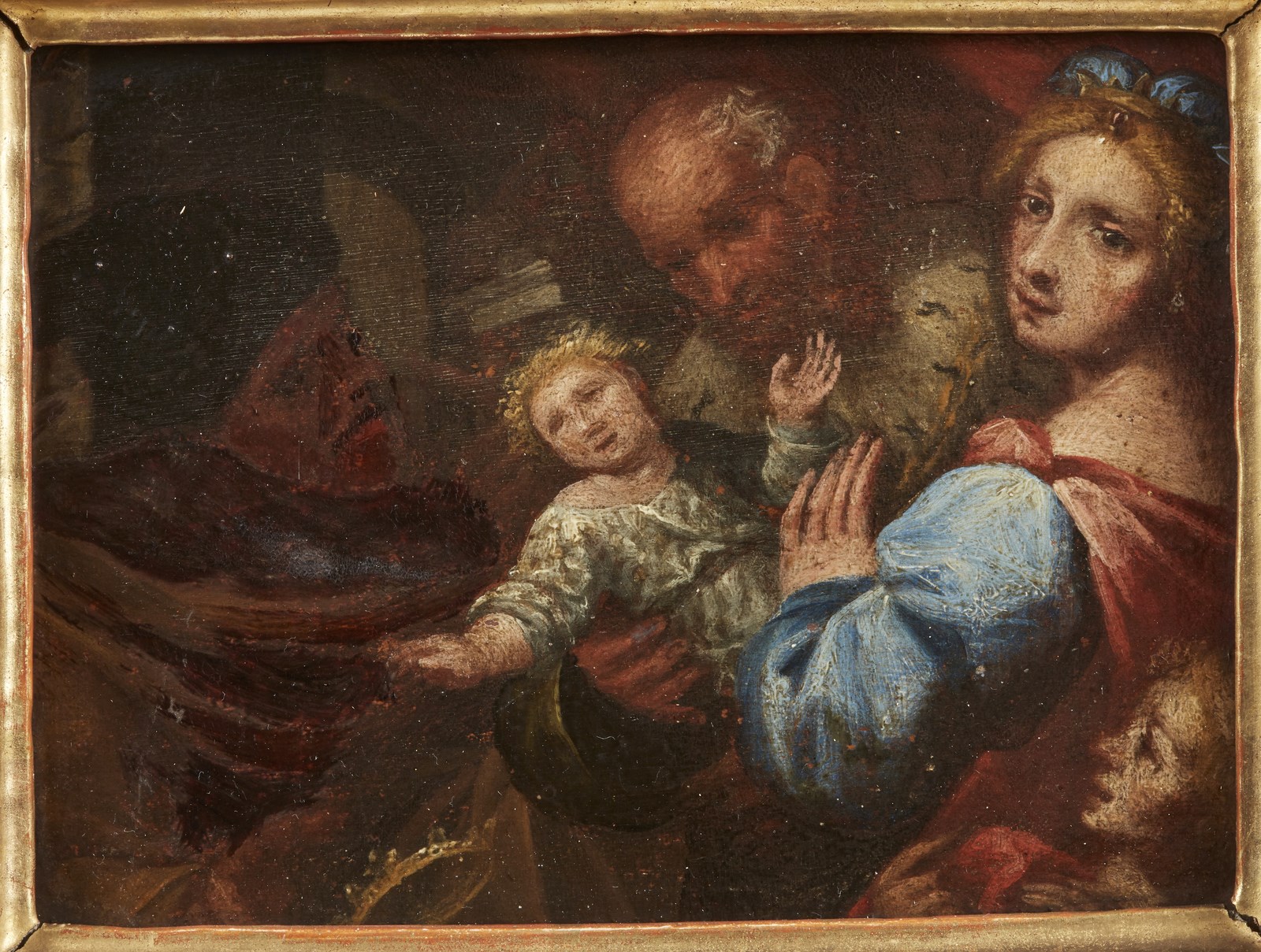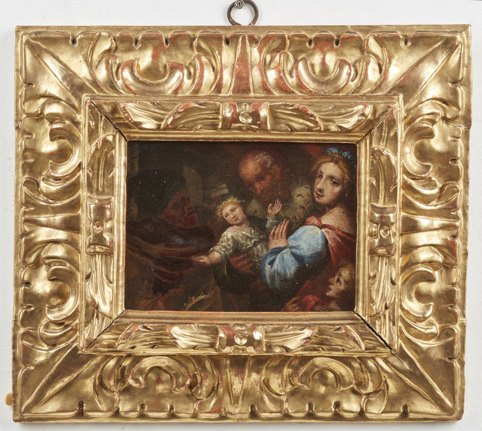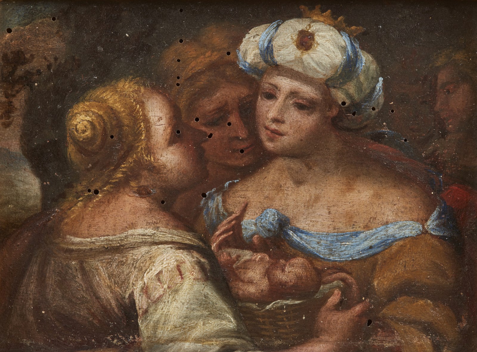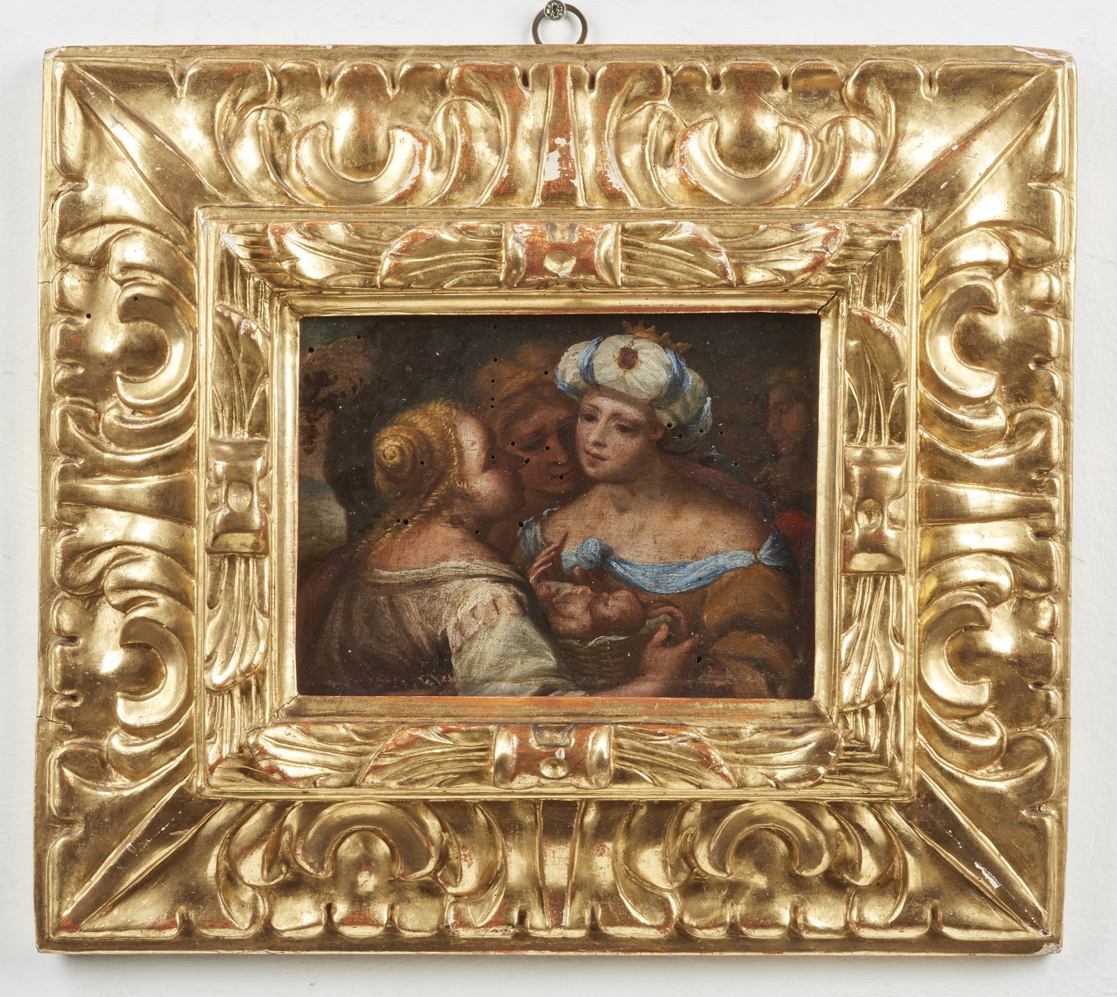 ARTISTA DEL XVIII SECOLO Coppia di dipinti raffiguranti Scena sacra e il Ritrovamento di Mosè. Olio su tavola. Cm 18,00 x 14,00. Difetti. Cornice presente