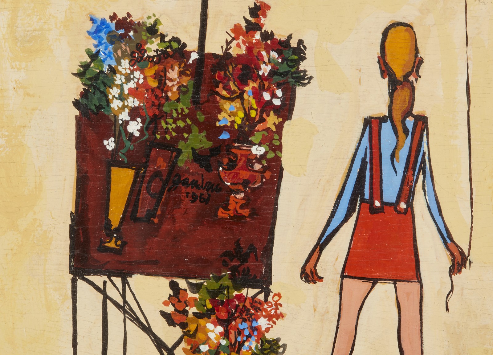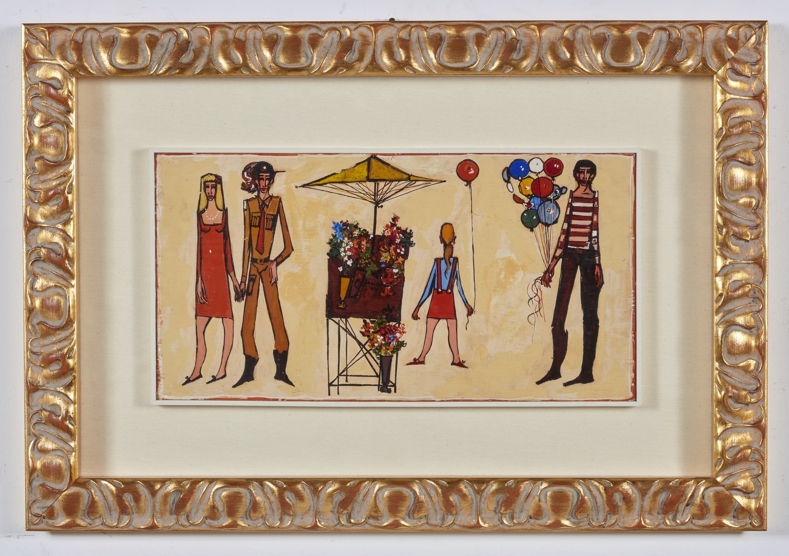 ARTISTA DEL XX SECOLO Paesaggio con personaggi. . Olio su tavola. Cm 45,00 x 23,00. Firmato e datato 1967 al centro. . Cornice presente
