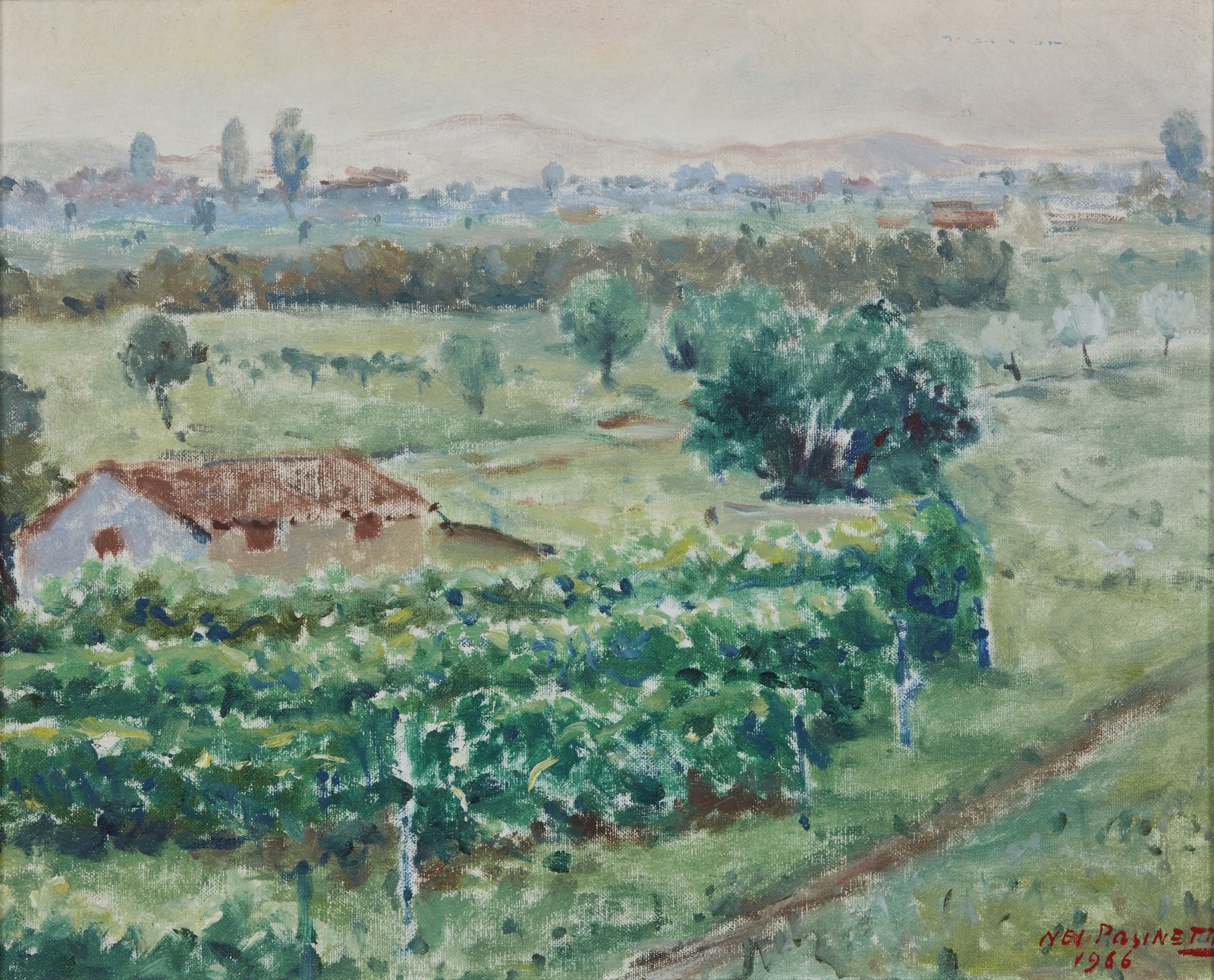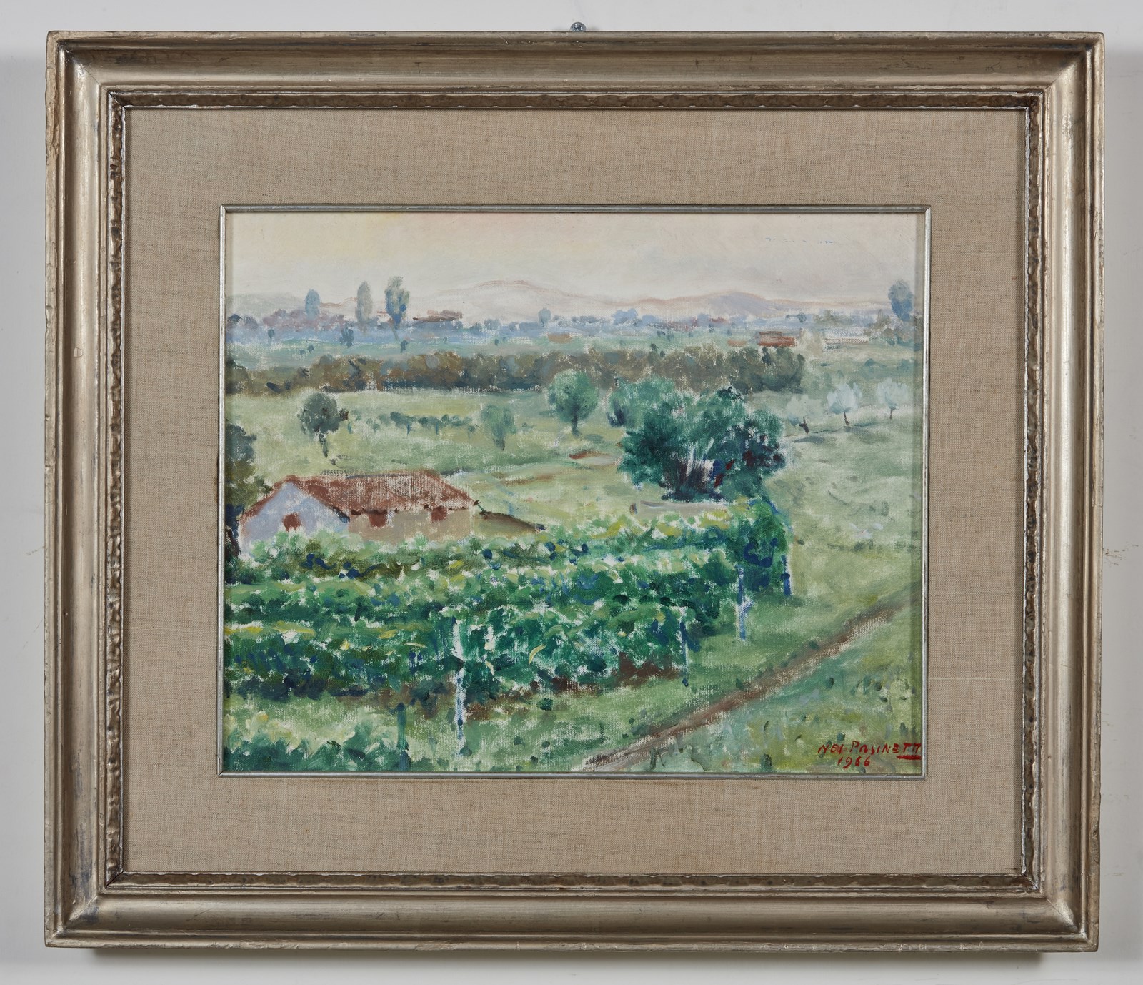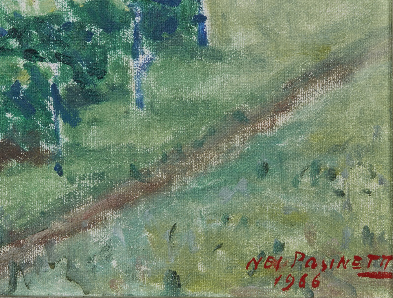 PASINETTI GIOVANNI NEI (1894 - 1979) Paesaggio montano con casolare. . Olio su tela . Cm 37,00 x 30,00. Firmato e datato 1966 in basso a destra.