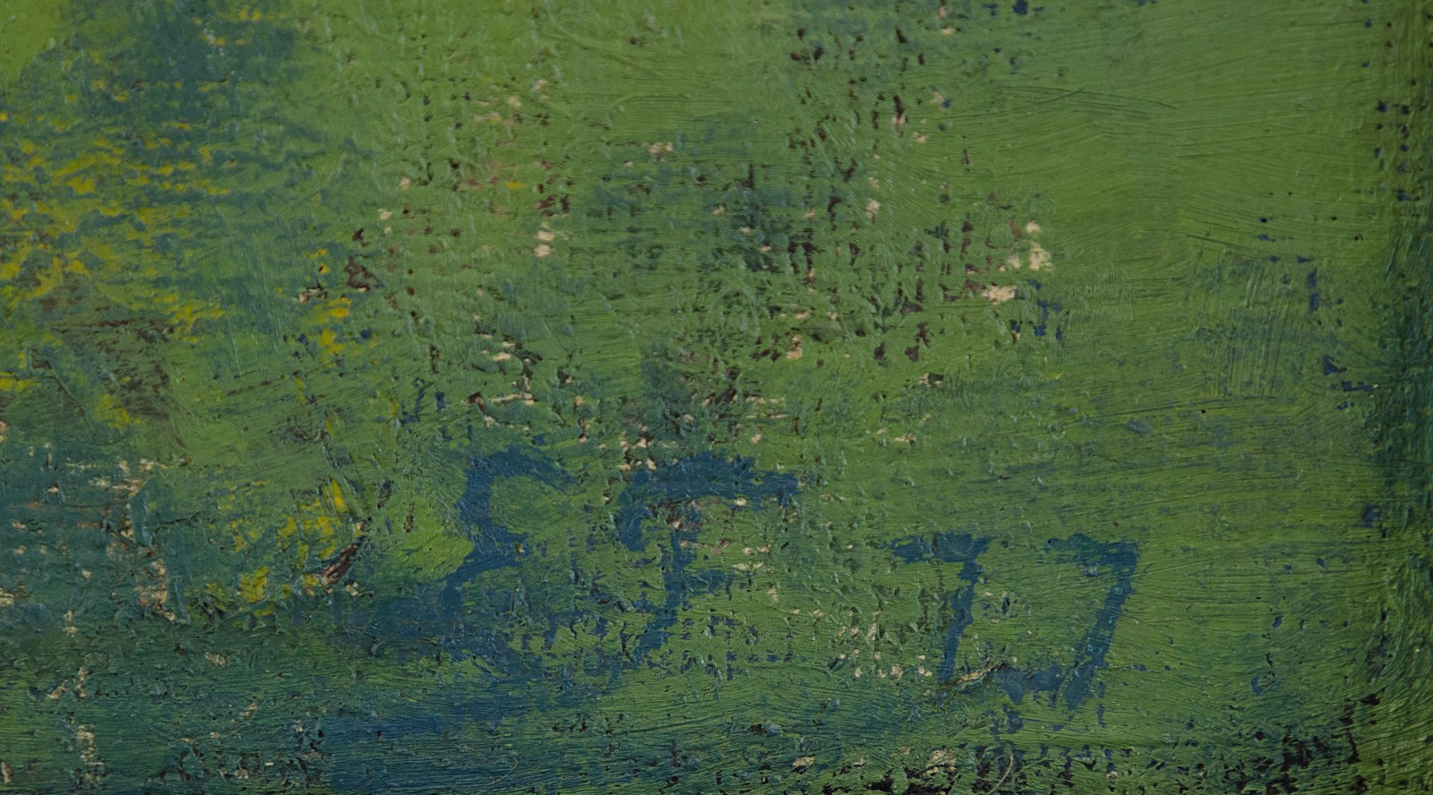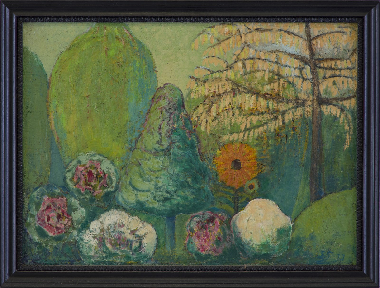ARTISTA NORDEUROPEO DEI PRIMI ANNI DEL XX SECOLO Paesaggio con alberi e fiori. Olio su tela . Cm 56,00 x 75,00. Firma monogrammata in basso a destra E.F. Cornice presente