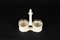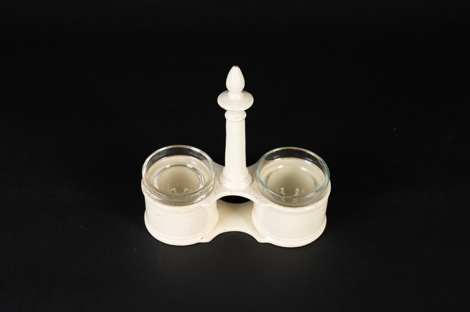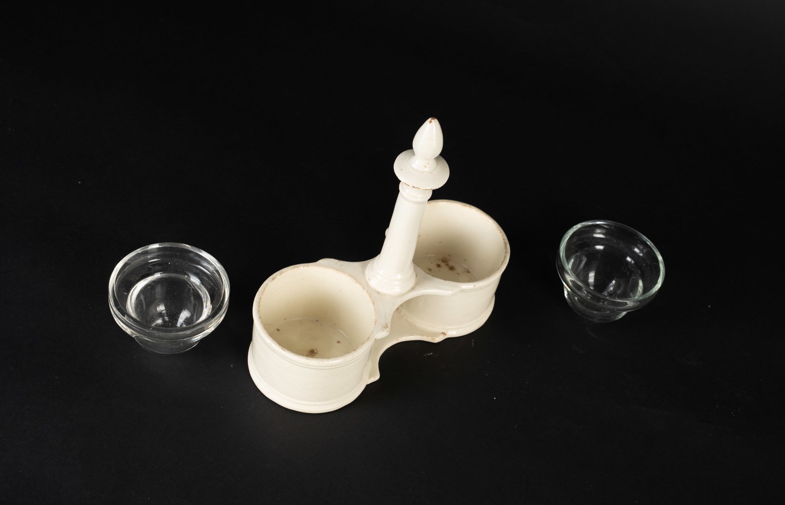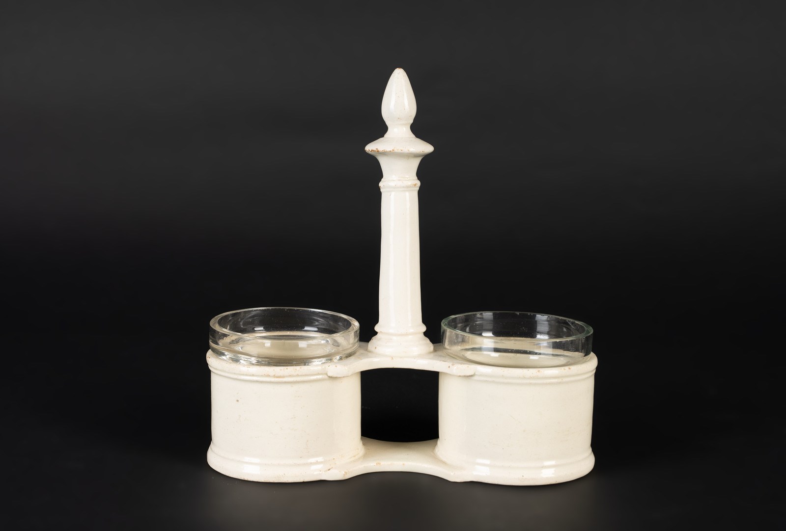 MANIFATTURA VENETA DEL XIX SECOLO Oliera in terraglia. . . Cm 18,00 x 20,00. Minime mancanze. Completi di contenitori in vetro.
