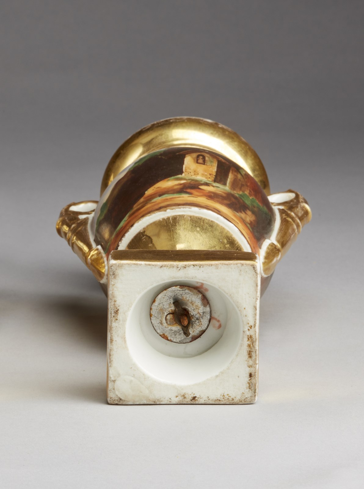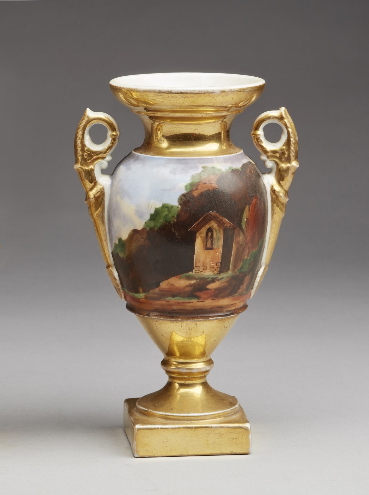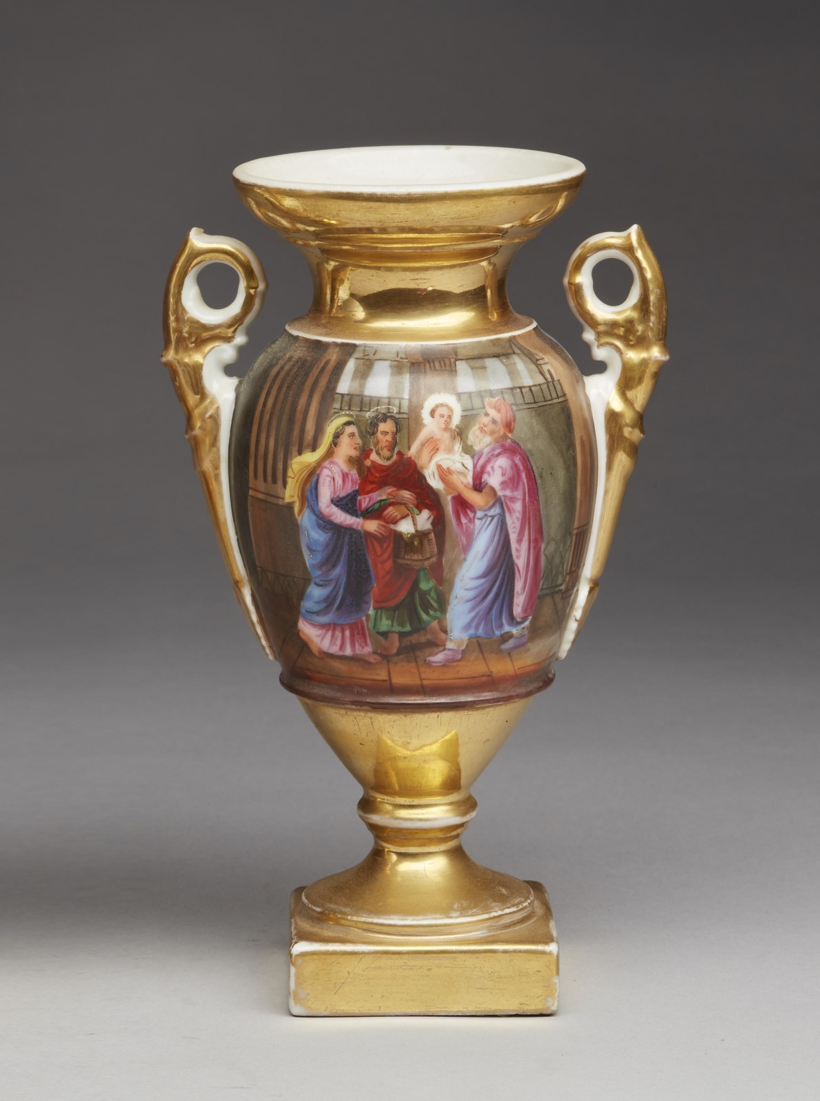 MANIFATTURA DEL XIX SECOLO - Vasetto in porcellana policroma e parzialmente dorata con scena sacra e paesaggio.