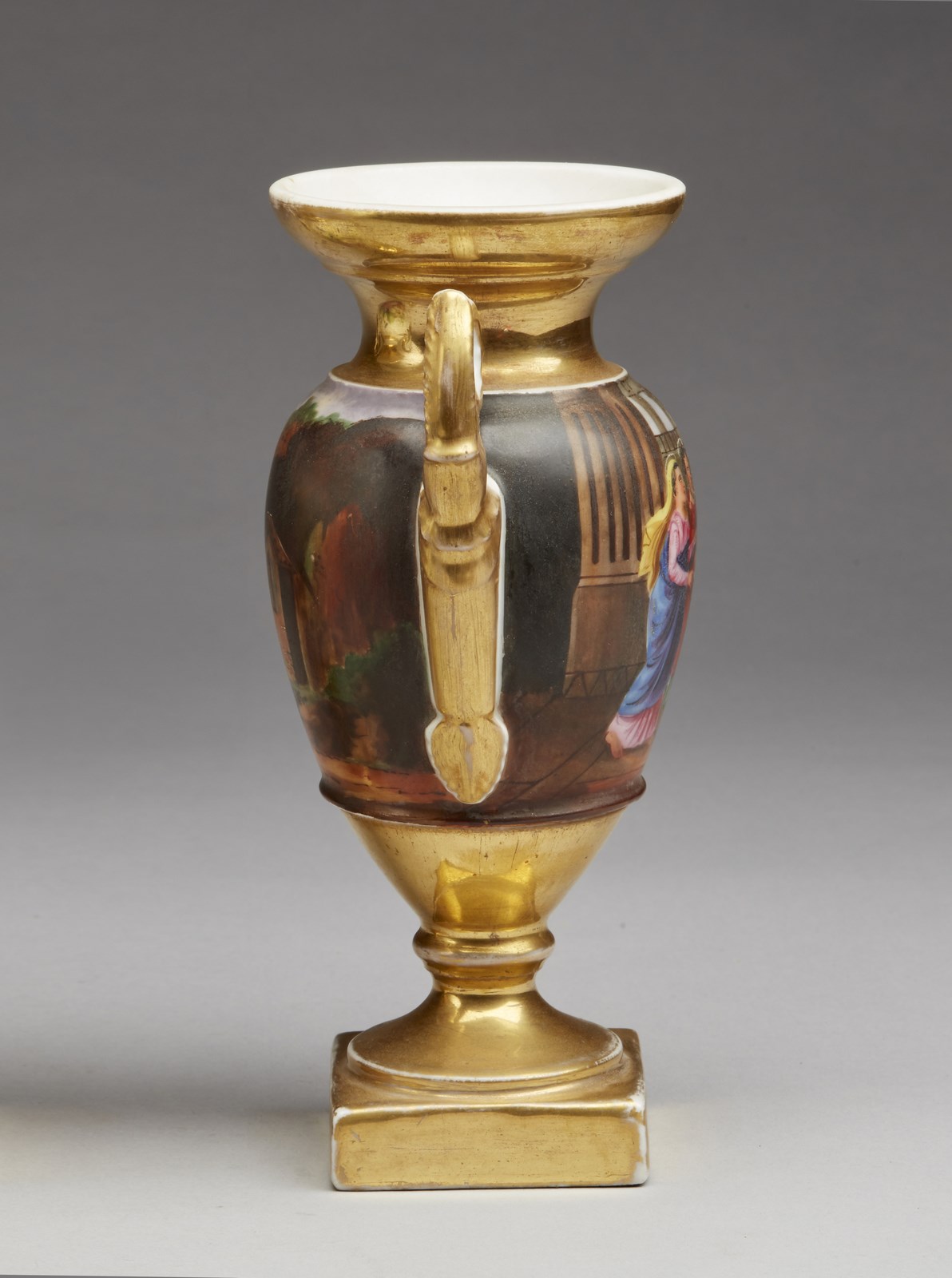 MANIFATTURA DEL XIX SECOLO Vasetto in porcellana policroma e parzialmente dorata con scena sacra e paesaggio. . Cm 11,00 x 17,50.