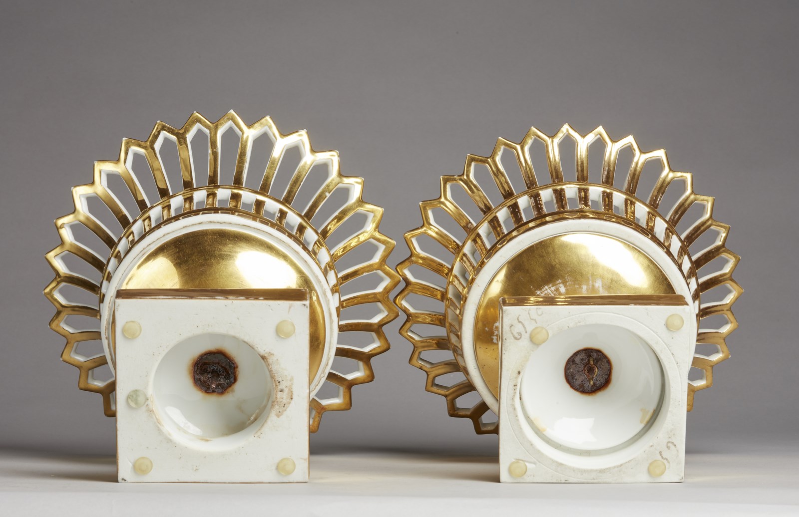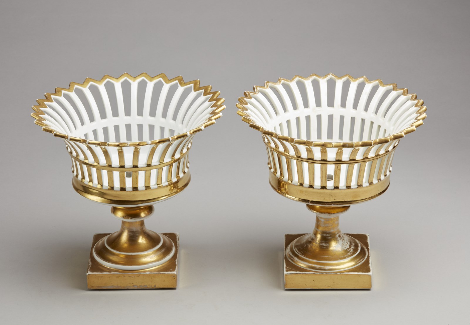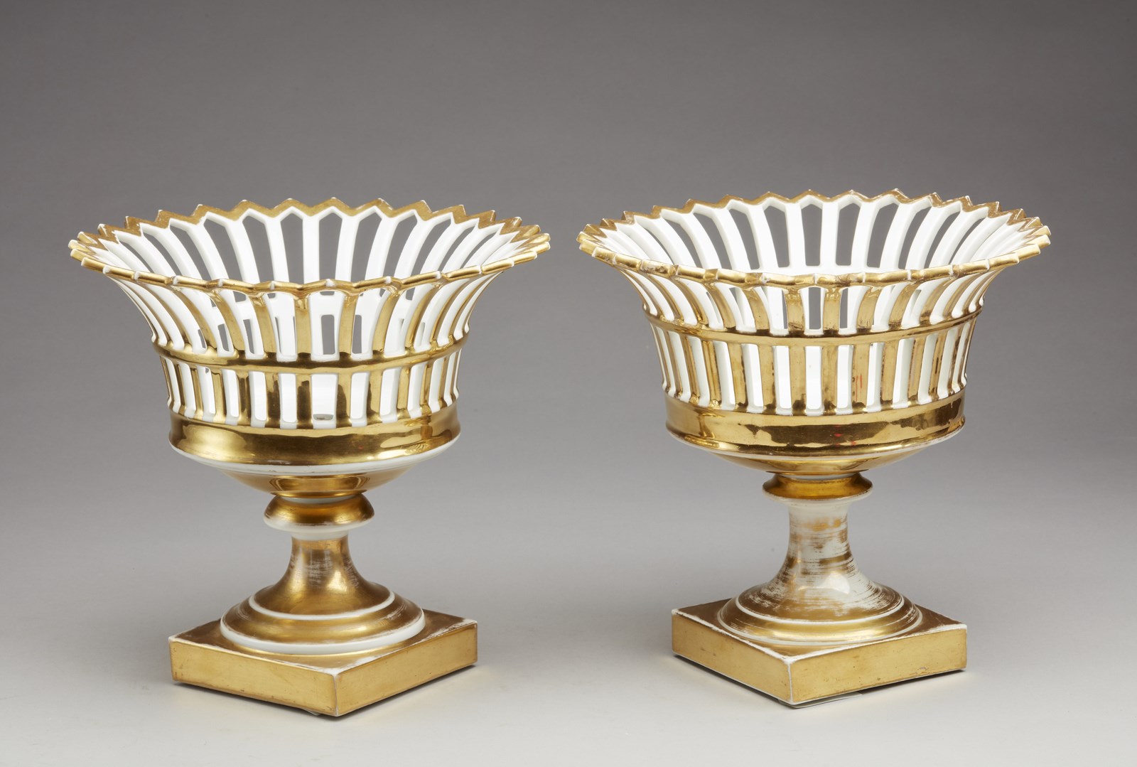 MANIFATTURA DEL XIX SECOLO Coppia di fruttiere in porcellana smaltata e parzialmente dorata poggianti su base quadrata. . Cm 22,50 x 22,50.