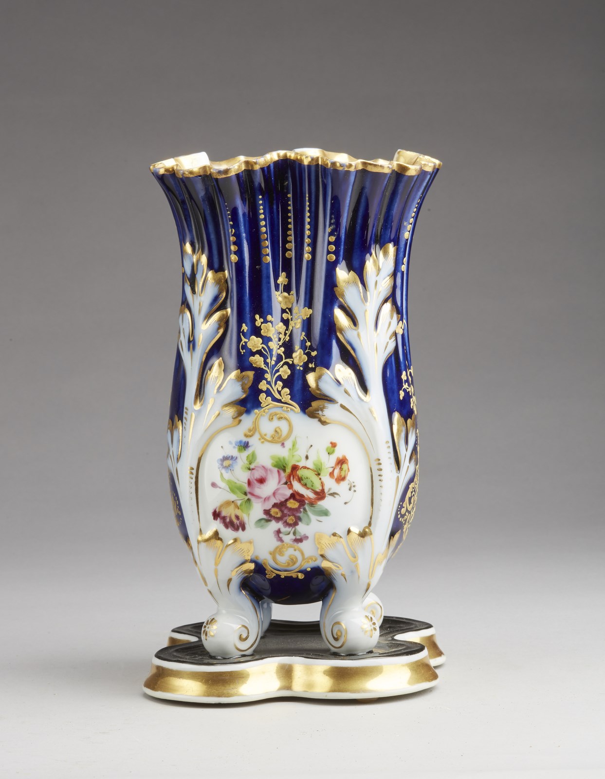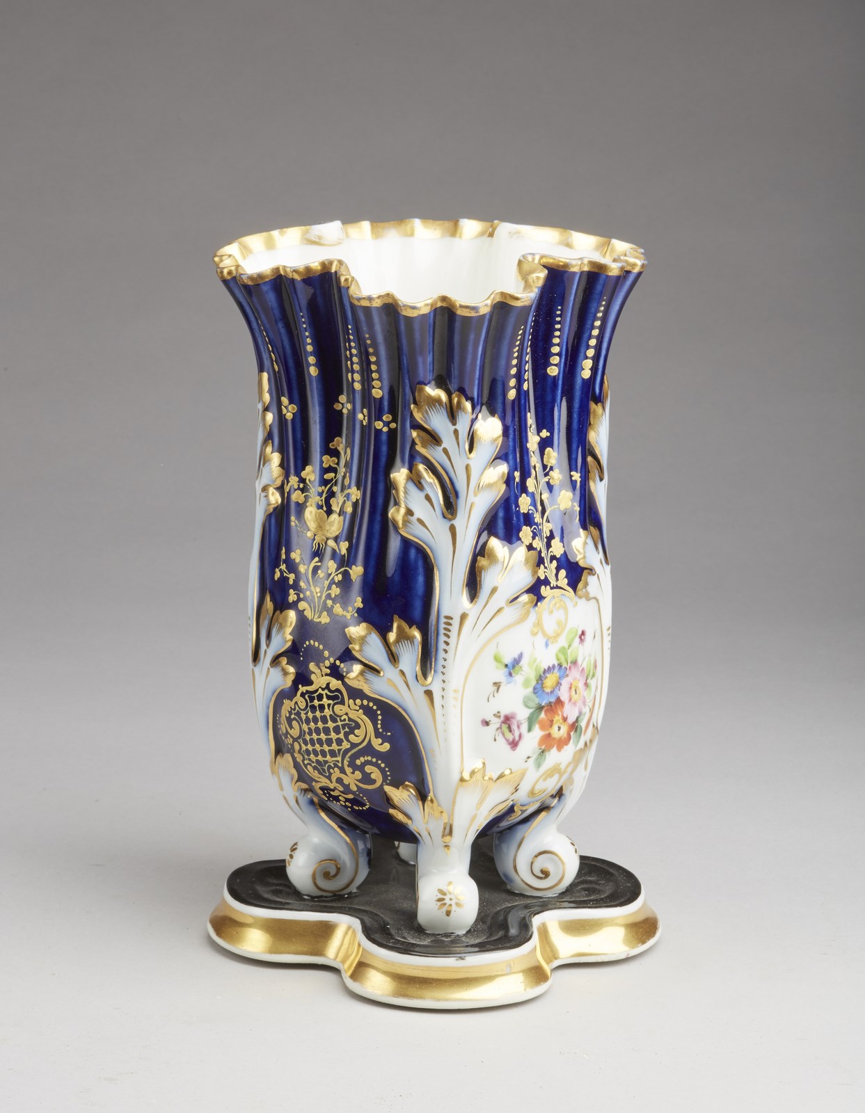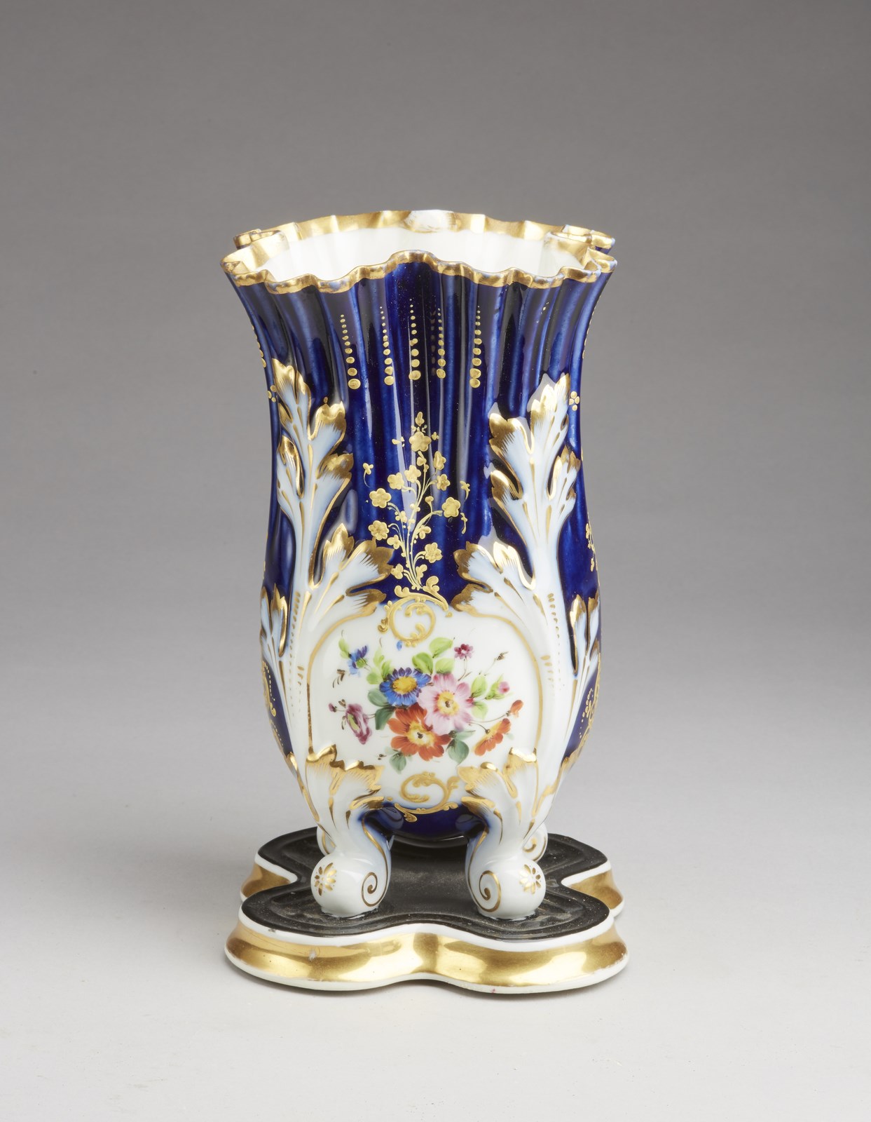 MANIFATTURA DEL XIX SECOLO - Vaso smaltato in porcellana parzialmente dorata e dipinta nei toni del blu e a decori floreali, poggiante su quattro piedini.