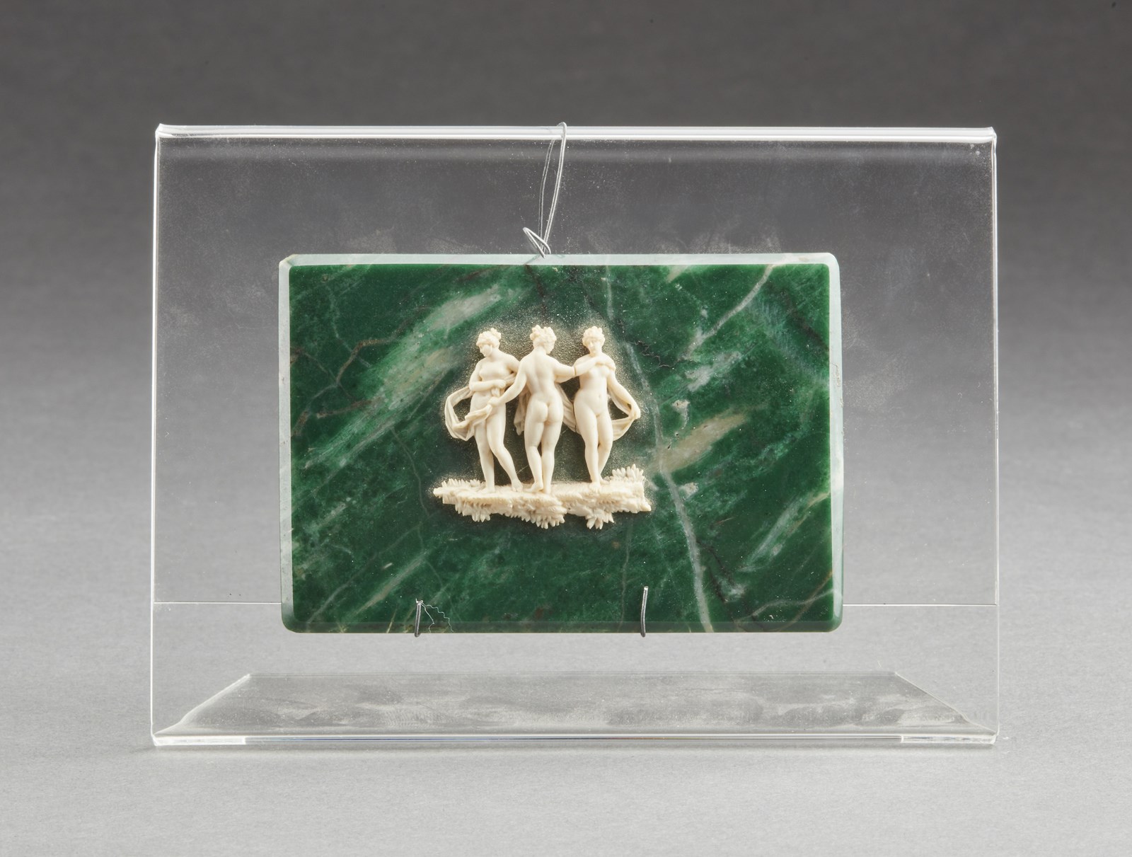 MANIFATTURA DEL XIX SECOLO - Piccola placca in nefrite con le Tre Grazie in avorio.