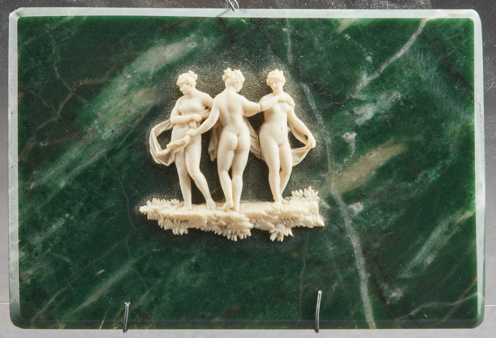 MANIFATTURA DEL XIX SECOLO Piccola placca in nefrite con le Tre Grazie in avorio. . Cm 8,60 x 6,00. Lotto corredato di perizia indipendente per la commercializzazione di antichi oggetti in avorio.