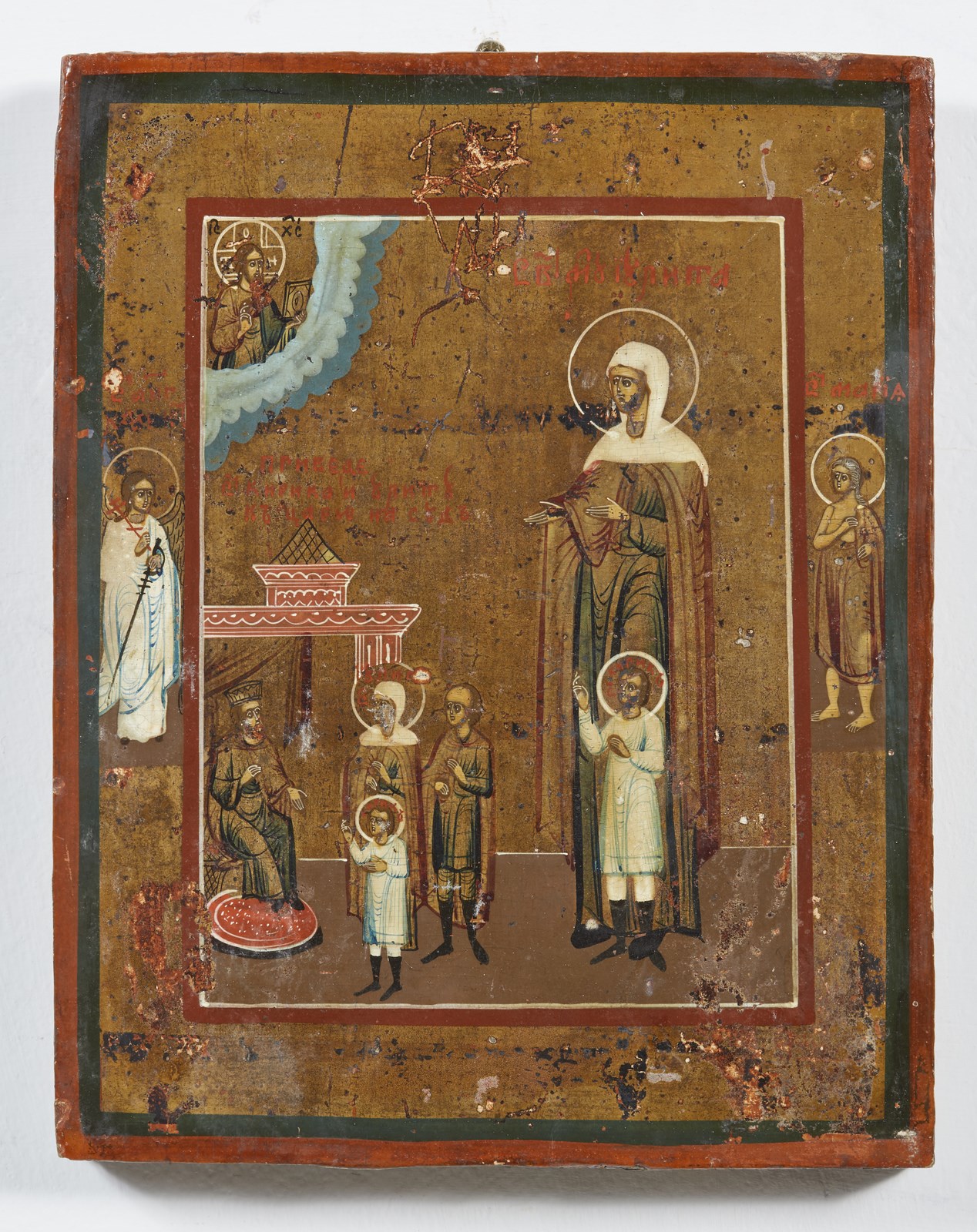 ICONA RUSSA DEL XIX SECOLO Santa Madre di Dio e santi. Tempera su tavola. Cm 18,50 x 22,00.