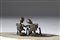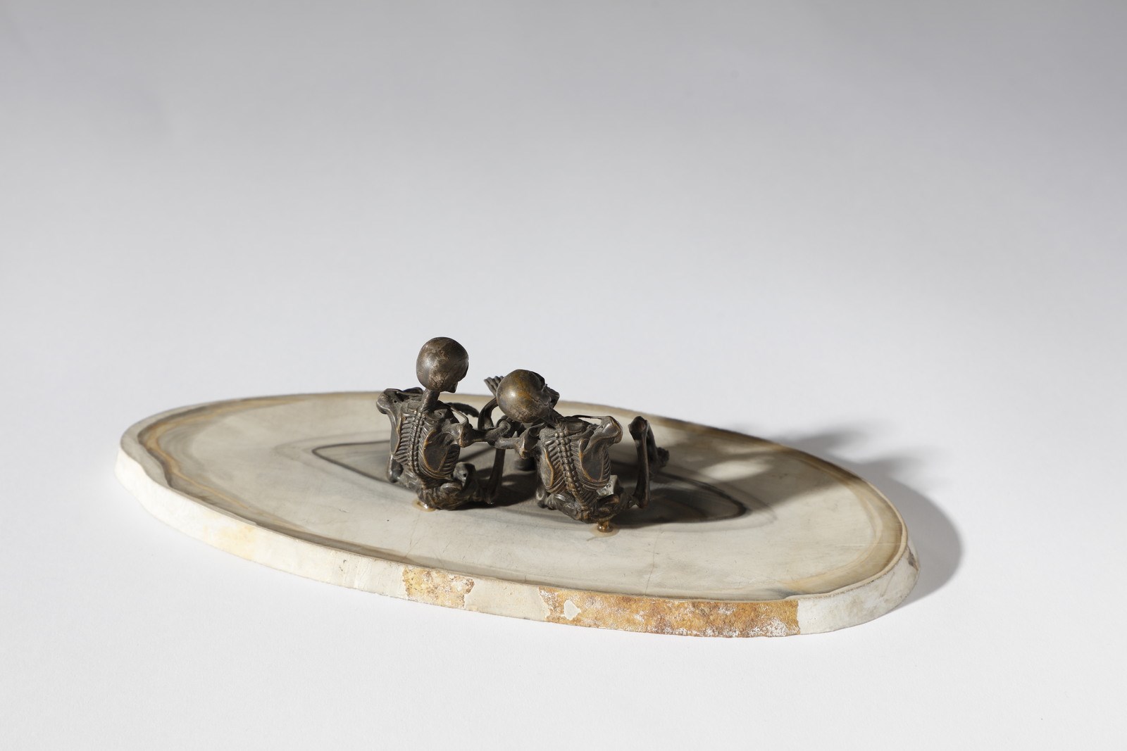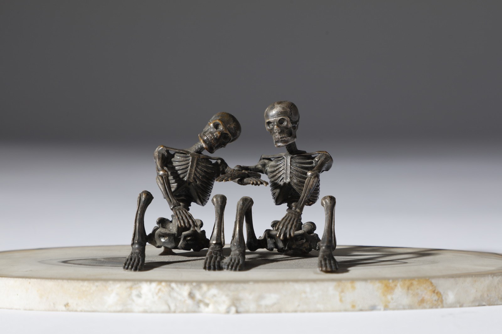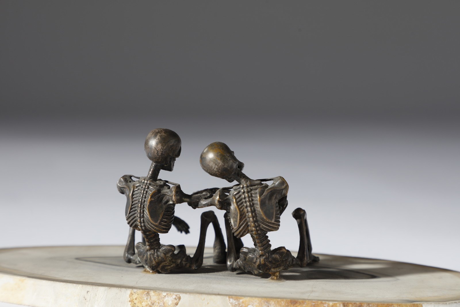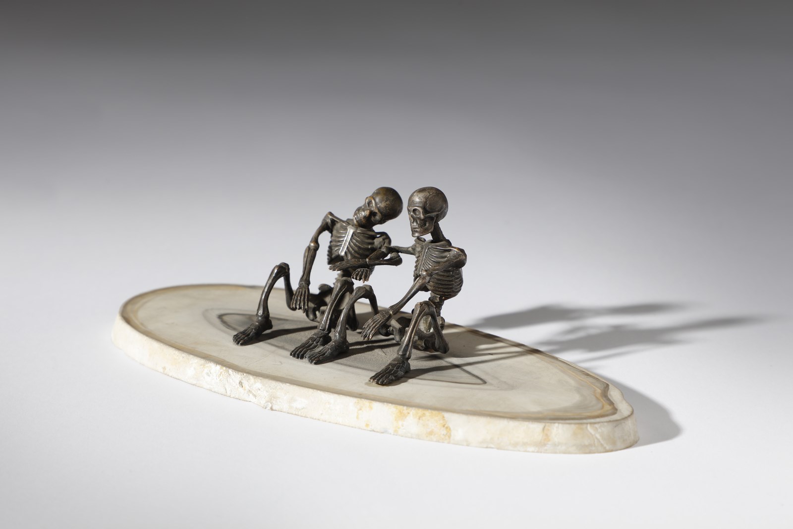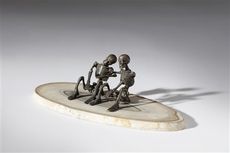 MANIFATTURA DEL XX SECOLO - Soprammobile in argento raffigurante due scheletri su base in onice.