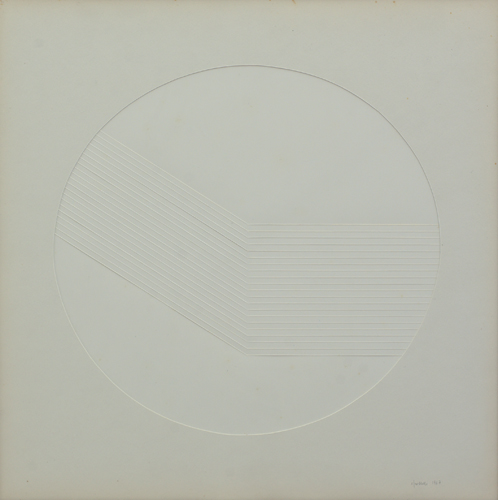 ETTORE SPALLETTI Cappelle sul Tavo (PE) 26/01/1940 Senza titolo, 1967 rilievi su cartoncino applicato su tavola cm. 33x33, firma e anno in basso a destra, dedica dell'artista ad personam datata 10-3-1971 al retro.