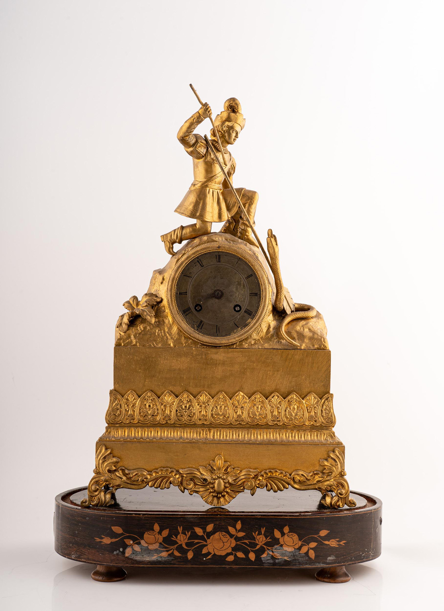 in metallo dorato, con base ovale in mogano intarsiato a fiori, mancanze, privo della campana in vetro