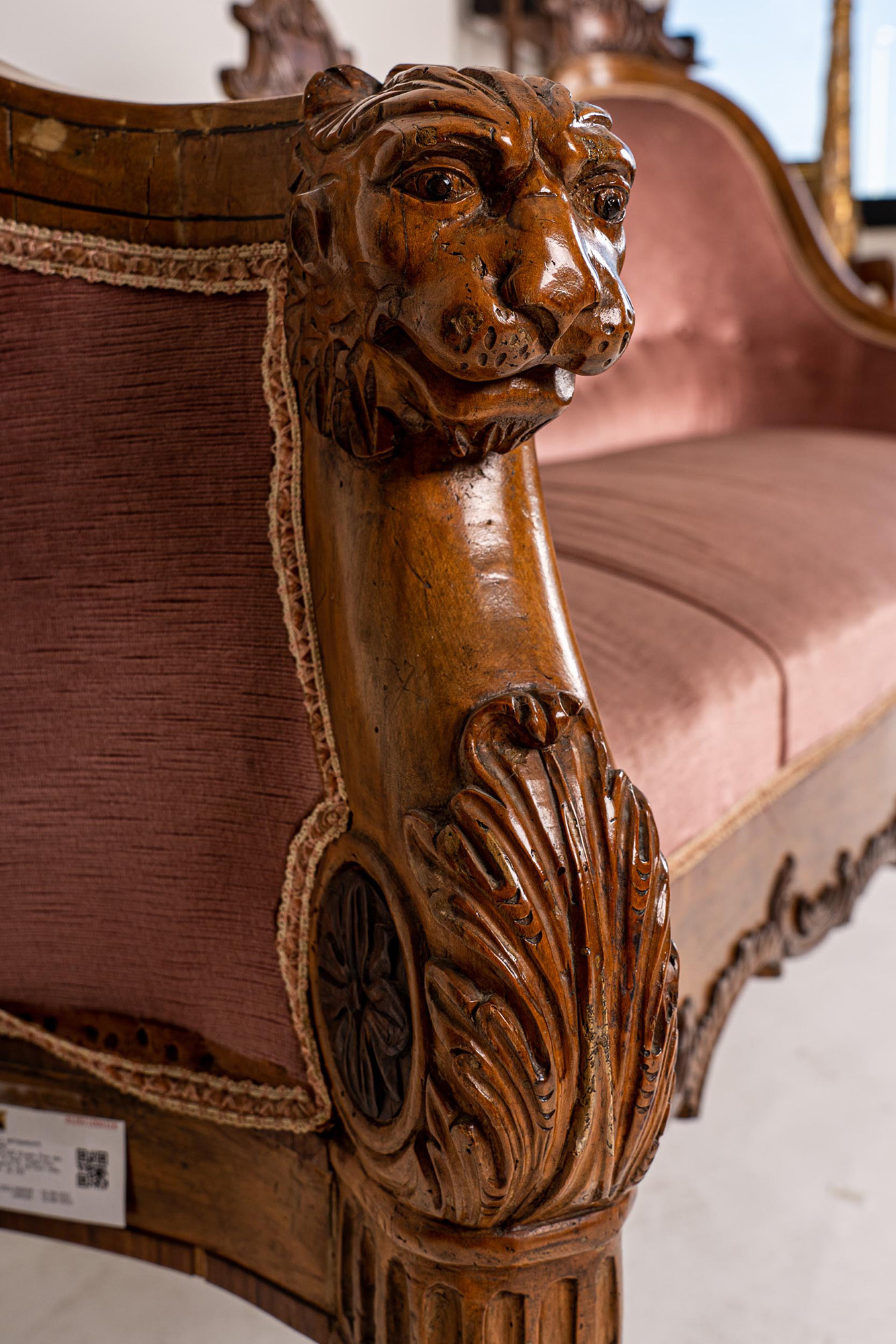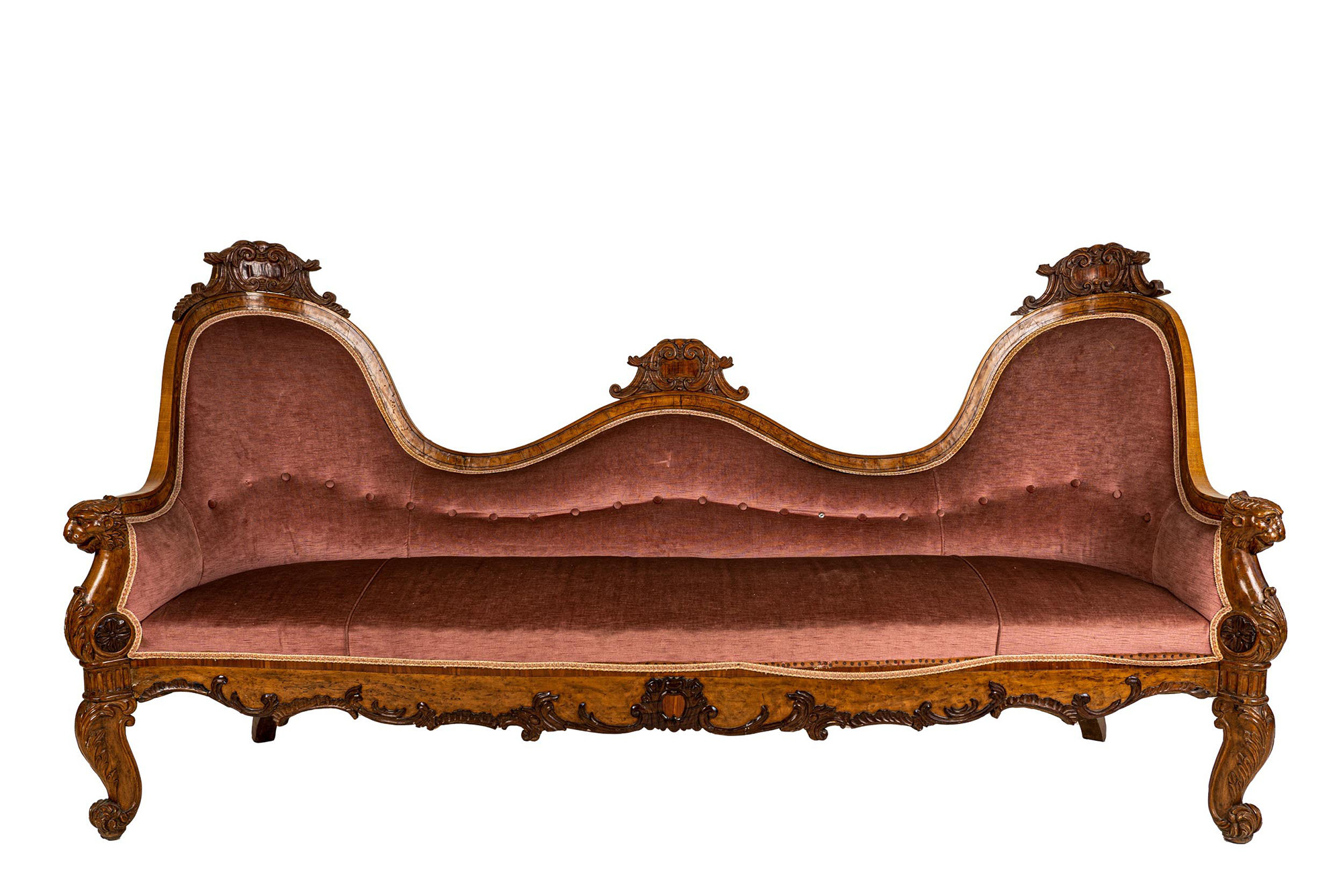 in noce intagliato, ricoperto in velluto rosa