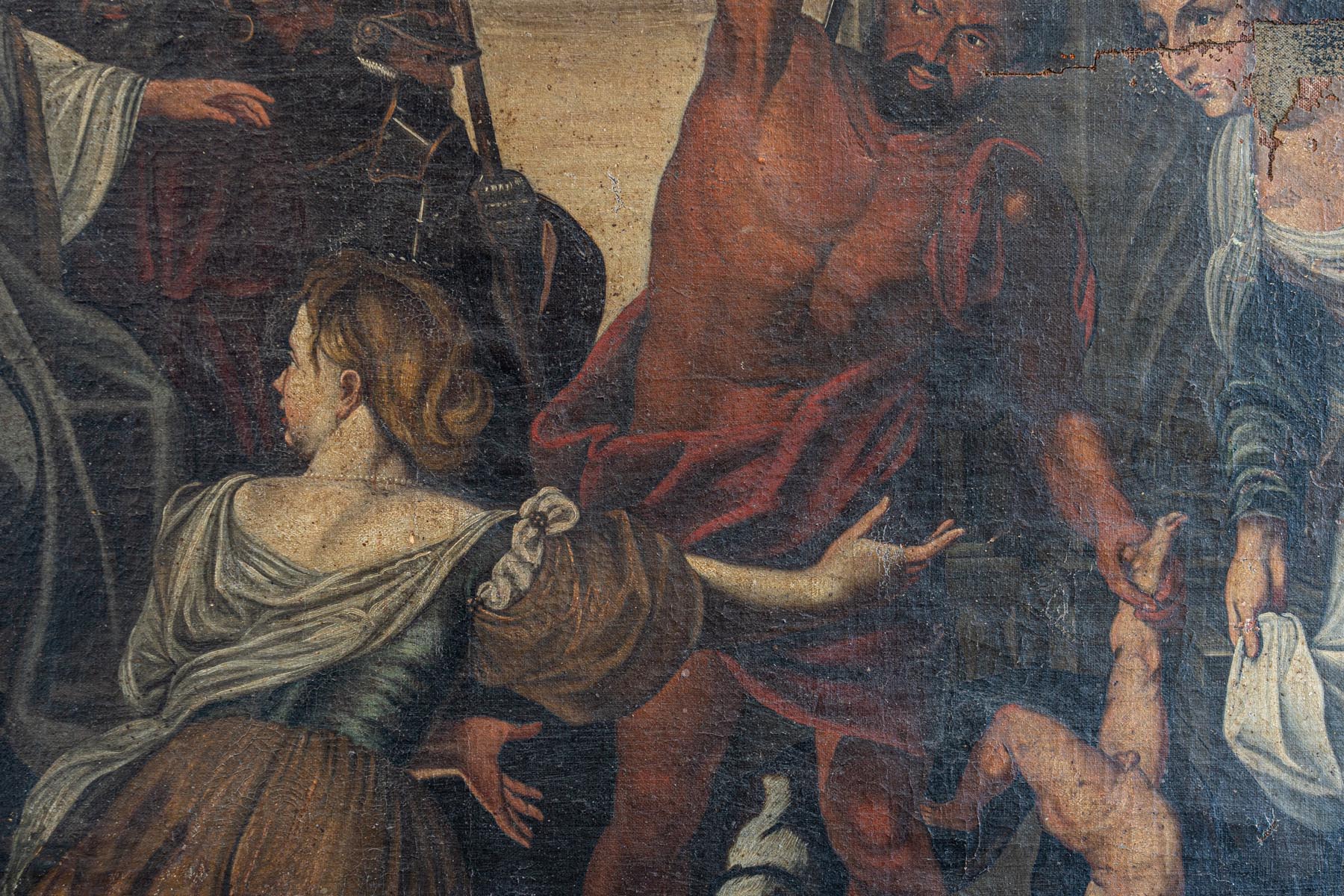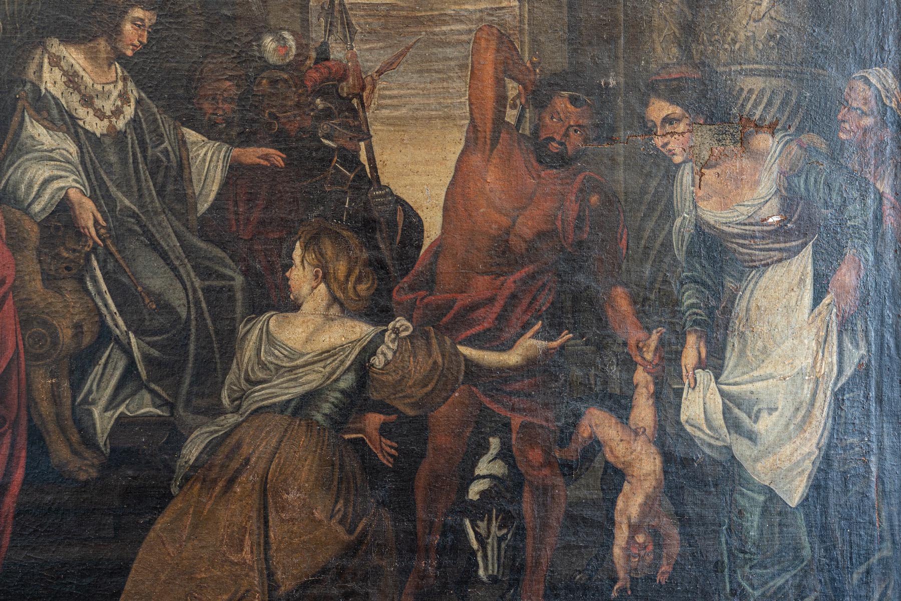 Il dipinto qui posto all'incanto raffigura l'episodio del Giudizio del Re Salomone, tratto dal Libro dei Re nell'Antico Testamento (I Re, 3, 16-28).