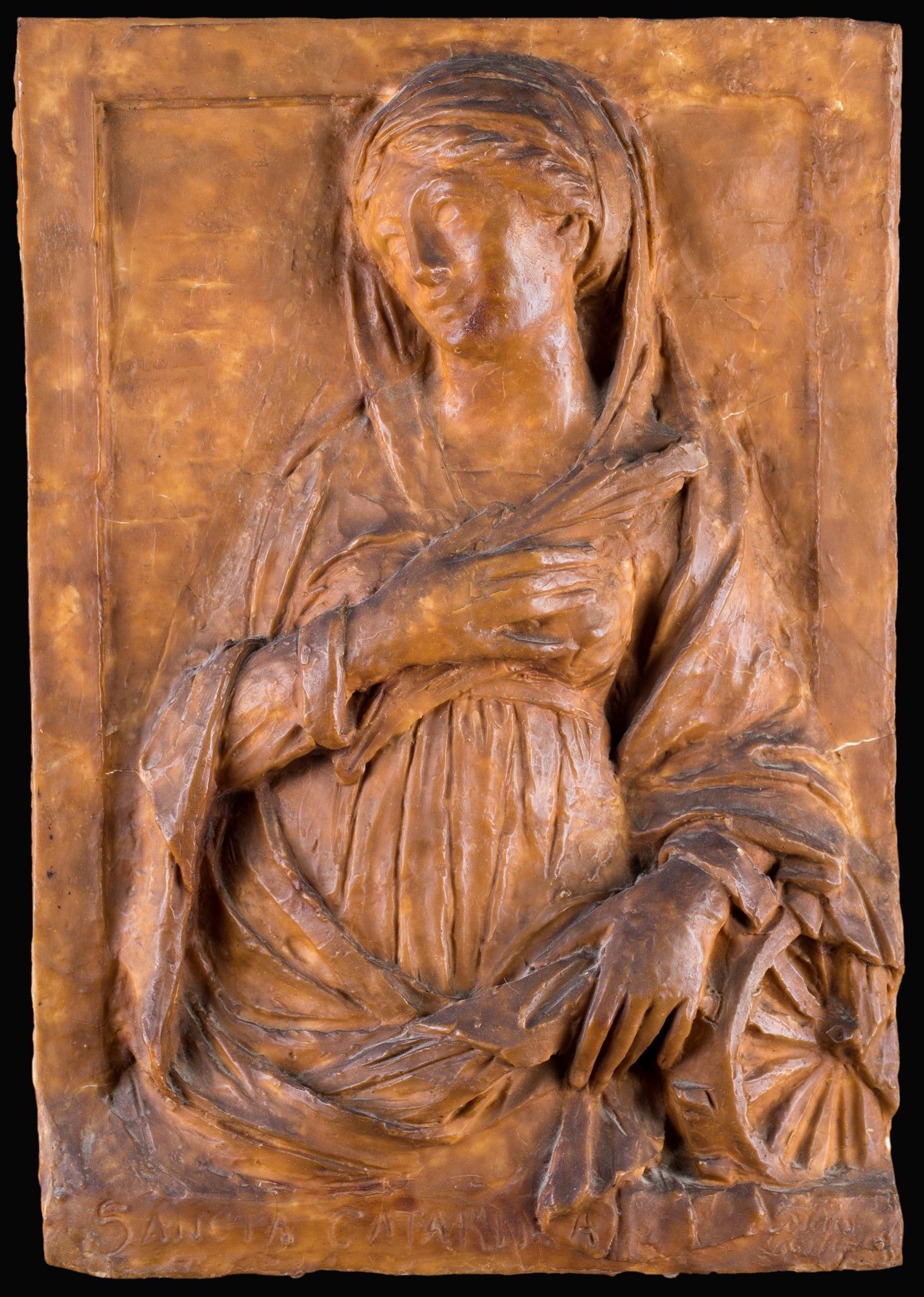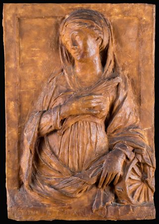 Bassorilievo in cera su anima in gesso raffigurante Santa Caterina; firmato...