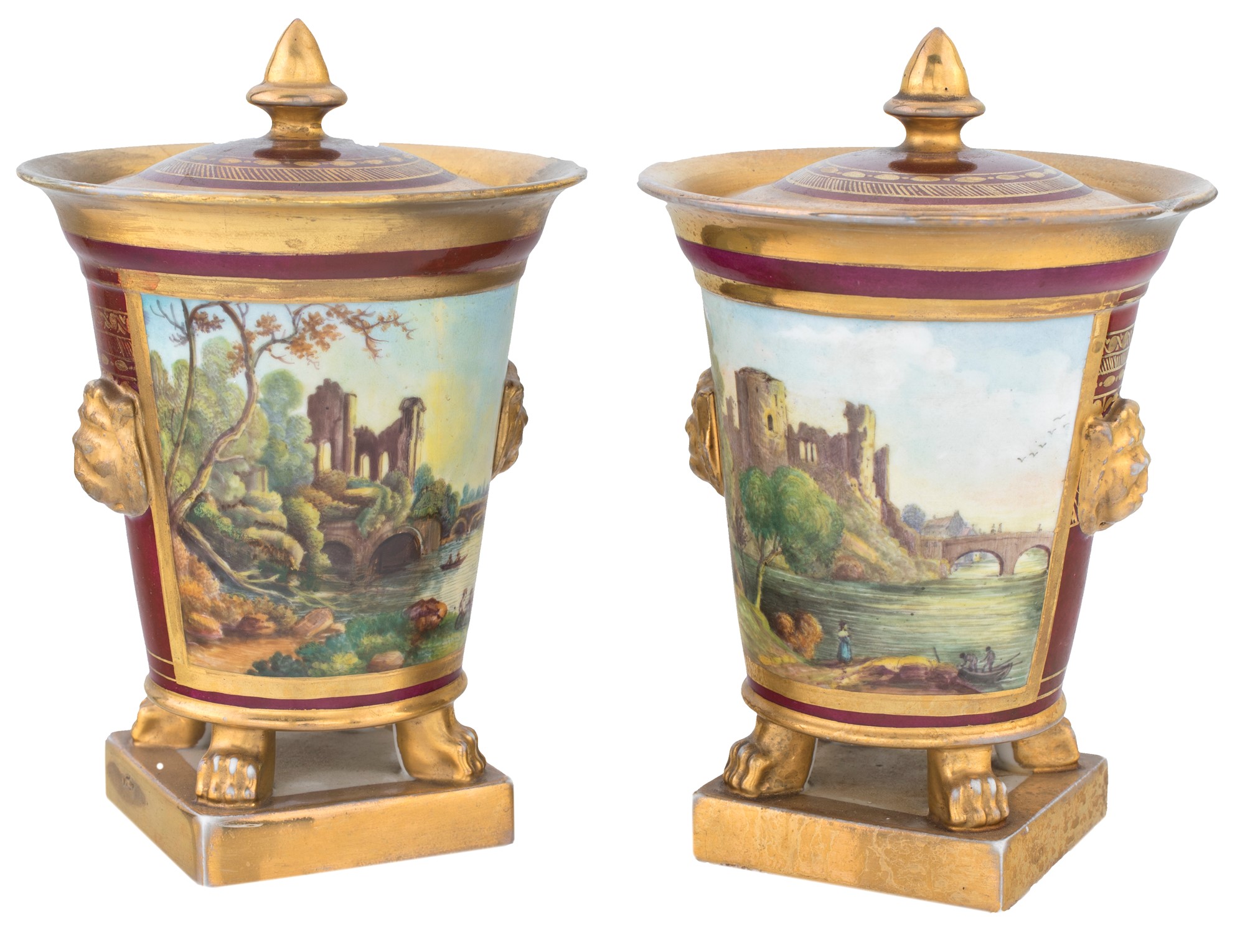 Coppia di vasi in porcellana d'epoca Impero con coperchio di forma conica su piedi ferini e base squadrata, sono decorati da belle vedute arcadiche policrome su fondo rosso amaranto con profili dorati; mascheroni ferini in rilievo completano la decorazione cm 21x14