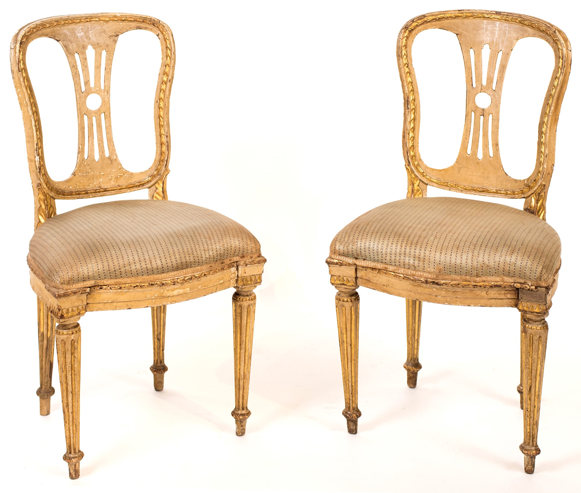Coppia di sedie in legno laccato, fine del XVIII secolo dorate lungo i profili ed i rilievi ornamentali; schienali a giorno, sedili imbottiti, gambe rastremate scanalate cm 92x50x44